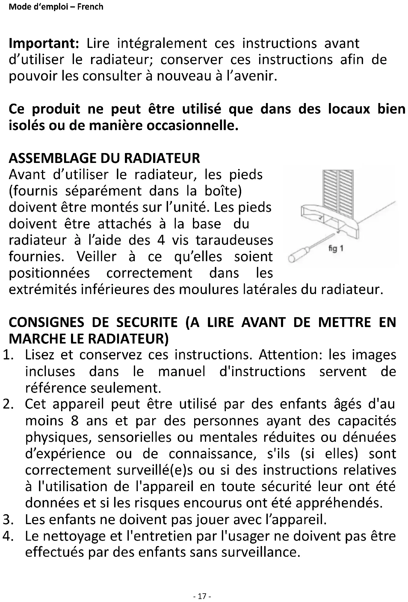 Avant d’utiliser le radiateur, les pieds (fournis séparément dans la boîte) doivent être montés sur l’unité. Les pieds doivent être attachés à la base du radiateur à l’aide des 4 vis taraudeuses fournies. Veiller à ce qu’elles soient positionnées correctement dans les extrémités inférieures des moulures latérales du radiateur. CONSIGNES DE SECURITE (A LIRE AVANT DE METTRE EN MARCHE LE RADIATEUR)