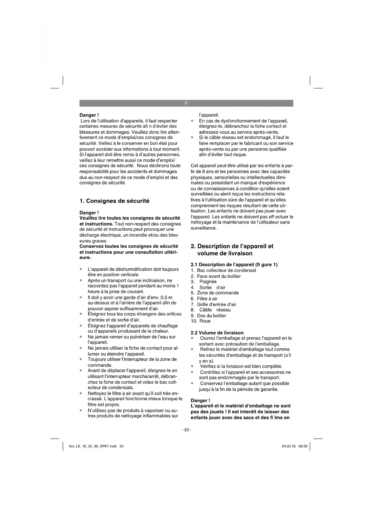 LE 16 Alimentation en tension : .........220-240 V ~ 50 Hz Intensité nominale absorbée max :. ........... 1,42 A Courant de démarrage : ................................10 A Puissance absorbée max. : ........................ 285 W Niveau de pression acoustique : ......... ≤ 47 dB(A) Capacité de déshumidifi cation : .......... 0,67 l/h (température ambiante de 30 °C et .......................................... humidité de l‘air 80 %) .......... 0,34 l/h (température ambiante de 27 °C et .......................................... humidité de l‘air 60 %) Humidité de fonctionnement : ................... > 40 % Température de fonctionnement : ...........5 – 35 °C Débit d‘air max. : .......................................180 m³ Capacité bac collecteur de condensats : ..........4 l Réfrigérant : ...............................................R134a Potentiel de contribution à l‘eff et de serre ........... (GWP, kg CO2 Eq.) ..................................... 1430 Quantité de fl uide frigorigène : .................... 160 g Dimensions de l’appareil : .... 316 x 316 x 536 mm Poids de l’appareil : ......................................13 kg LE 20 Alimentation en tension : .........220-240 V ~ 50 Hz Intensité nominale absorbée max :. ........... 1,74 A Courant de démarrage : ................................10 A Puissance absorbée max. : ........................ 350 W Niveau de pression acoustique : ......... ≤ 47 dB(A) Capacité de déshumidifi cation : .......... 0,83 l/h (température ambiante de 30 °C et .......................................... humidité de l‘air 80 %) .......... 0,42 l/h (température ambiante de 27 °C et .......................................... humidité de l‘air 60 %) Humidité de fonctionnement : ................... > 40 % Température de fonctionnement : ...........5 – 35 °C Débit d‘air max. : .......................................180 m³ Capacité bac collecteur de condensats : ..........4 l Réfrigérant : ...............................................R134a Potentiel de contribution à l‘eff et de serre ........... (GWP, kg CO2 Eq.) ..................................... 1430 Quantité de fl uide frigorigène : .................... 250 g Dimensions de l’appareil : .... 316 x 316 x 536 mm Poids de l’appareil : ......................................14 kg Anl_LE_16_20_30_SPK7.indb 21Anl_LE_16_20_30_SPK7.indb 21 24.02.16 08:3324.02.16 08:33F
