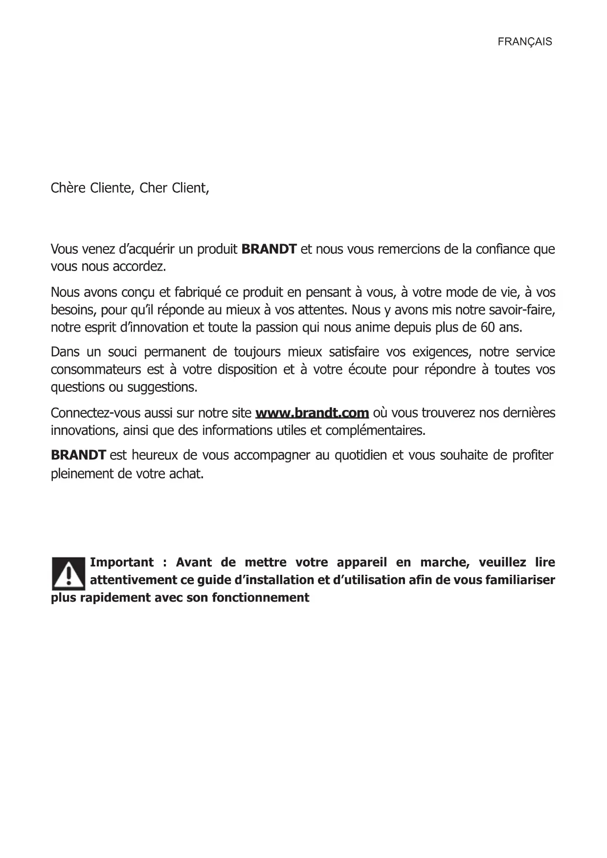 5.1FRANÇAIS Chère Cliente, Cher Client, Vous venez d’acquérir un produit BRANDT et nous vous remercions de la confiance que vous nous accordez. Nous avons conçu et fabriqué ce produit en pensant à vous, à votre mode de vie, à vos besoins, pour qu’il réponde au mieux à vos attentes. Nous y avons mis notre savoir-faire, notre esprit d’innovation et toute la passion qui nous anime depuis plus de 60 ans. Dans un souci permanent de toujours mieux satisfaire vos exigences, notre service consommateurs est à votre disposition et à votre écoute pour répondre à toutes vos questions ou suggestions. Connectez-vous aussi sur notre site www.brandt.com où vous trouverez nos dernières innovations, ainsi que des informations utiles et complémentaires. BRANDT est heureux de vous accompagner au quotidien et vous souhaite de profiter pleinement de votre achat. Important : Avant de mettre votre appareil en marche, veuillez lire attentivement ce guide d’installation et d’utilisation afin de vous familiariser plus rapidement avec son fonctionnementFRANÇAIS