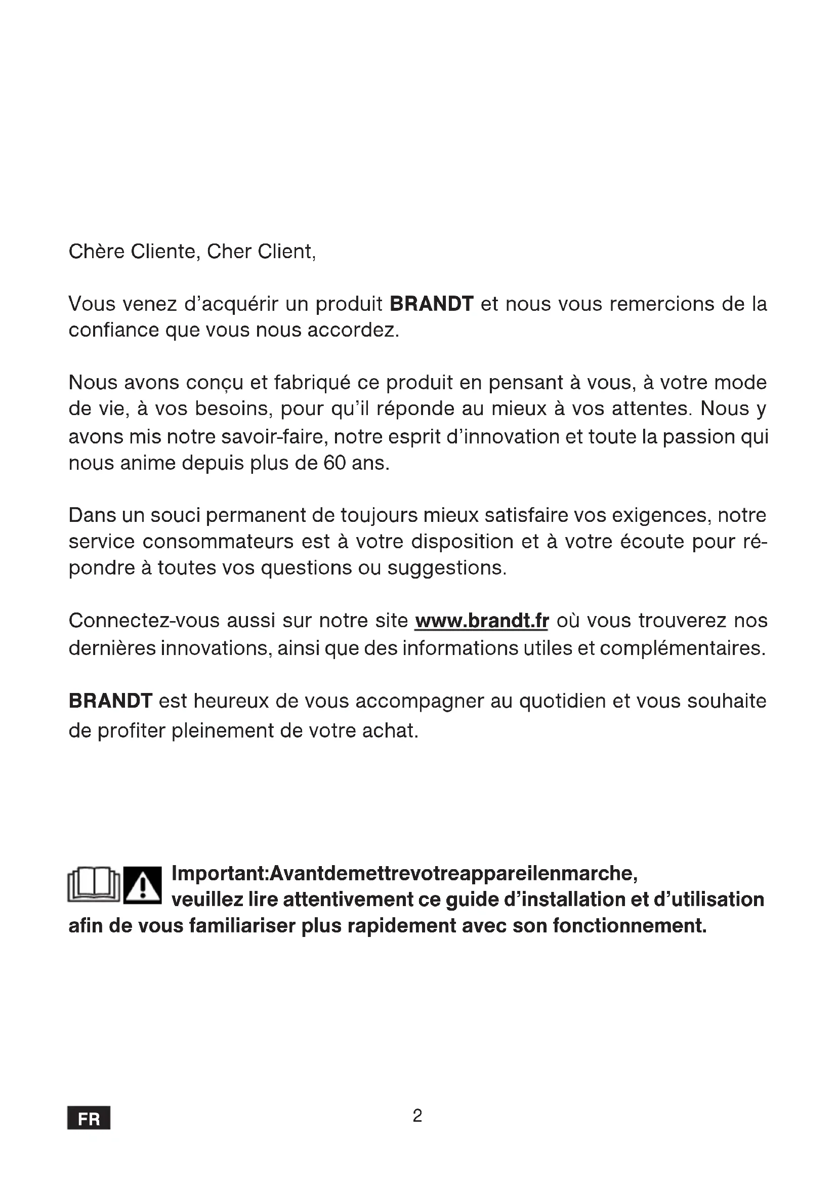 Chère Cliente, Cher Client, Vous venez d’acquérir un produit BRANDT et nous vous remercions de la confiance que vous nous accordez. Nous avons conçu et fabriqué ce produit en pensant à vous, à votre mode de vie, à vos besoins, pour qu’il réponde au mieux à vos attentes. Nous y avons mis notre savoir-faire, notre esprit d’innovation et toute la passion qui nous anime depuis plus de 60 ans. Dans un souci permanent de toujours mieux satisfaire vos exigences, notre service consommateurs est à votre disposition et à votre écoute pour ré- pondre à toutes vos questions ou suggestions. Connectez-vous aussi sur notre site www.brandt.fr où vous trouverez nos dernières innovations, ainsi que des informations utiles et complémentaires. BRANDT est heureux de vous accompagner au quotidien et vous souhaite de profiter pleinement de votre achat. Important : Avant de mettre votre appareil en marche, veuillez lire attentivement ce guide d’installation et d’utilisation afin de vous familiariser plus rapidement avec son fonctionnement.3
