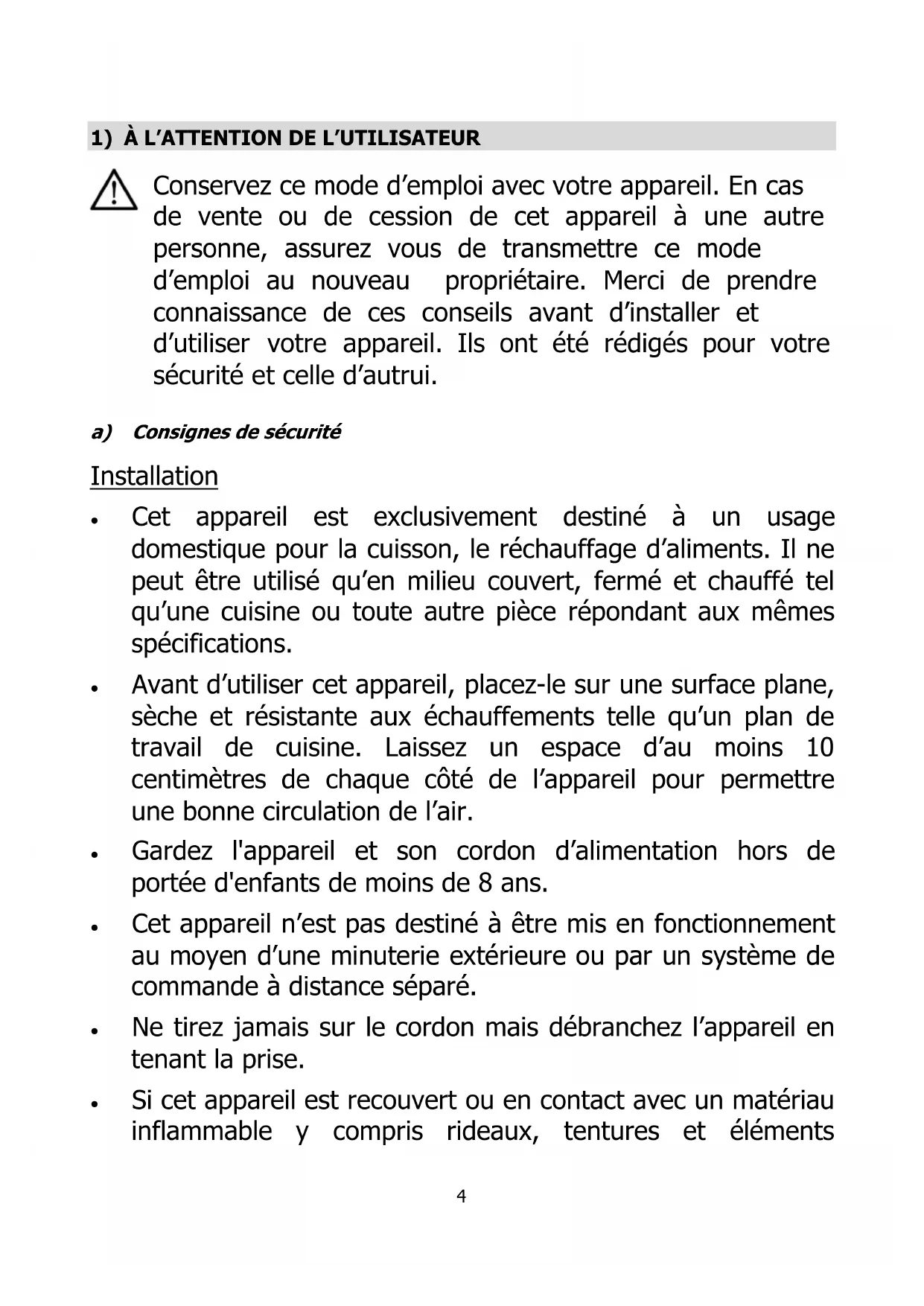 Conservez ce mode d’emploi avec votre appareil. En cas de vente ou de cession de cet appareil à une autre personne, assurez vous de transmettre ce mode d’emploi au nouveau propriétaire. Merci de prendre connaissance de ces conseils avant d’installer et d’utiliser votre appareil. Ils ont été rédigés pour votre sécurité et celle d’autrui. a) Consignes de sécurité Installation Cet appareil est exclusivement destiné à un usage domestique pour la cuisson, le réchauffage d’aliments. Il ne peut être utilisé qu’en milieu couvert, fermé et chauffé tel qu’une cuisine ou toute autre pièce répondant aux mêmes spécifications. Avant d’utiliser cet appareil, placez-le sur une surface plane, sèche et résistante aux échauffements telle qu’un plan de travail de cuisine. Laissez un espace d’au moins 10 centimètres de chaque côté de l’appareil pour permettre une bonne circulation de l’air. Gardez l'appareil et son cordon d’alimentation hors de portée d'enfants de moins de 8 ans. Cet appareil n’est pas destiné à être mis en fonctionnement au moyen d’une minuterie extérieure ou par un système de commande à distance séparé. Ne tirez jamais sur le cordon mais débranchez l’appareil en tenant la prise. Si cet appareil est recouvert ou en contact avec un matériau inflammable y compris rideaux, tentures et éléments5 similaires, il existe un risque d’incendie lors de son fonctionnement. Les enfants ne doivent pas jouer avec l’appareil. Utilisation Cet appareil peut être utilisé par des enfants âgés de 8 ans et plus ainsi que par des personnes à capacités physiques, sensorielles ou mentales réduites, seulement après leur avoir donné les informations nécessaires concernant l'utilisation de l'appareil, afin qu’ils aient conscience des dangers. Les parties accessibles de cet appareil peuvent devenir chaudes pendant son fonctionnement. Les jeunes enfants doivent être tenus à l’écart à moins qu’ils ne soient continuellement surveillés. Ne touchez pas les surfaces chaudes de cet appareil pendant son fonctionnement. Ne placez aucun élément sur l’appareil lorsqu’il est en fonctionnement. Ne recouvrez pas une partie du four avec du papier aluminium. Cela peut entrainer des dysfonctionnements et un risque d’incendie. Ne laissez pas le cordon d’alimentation entrer en contact avec des surfaces chaudes. Ne mettez aucun des matériaux suivants dans le four : carton, plastique, papier ou matériaux similaires sensibles aux échauffements. Veillez à ne pas insérer des ustensiles ou des aliments trop volumineux. Les ustensiles et aliments ne doivent pas être en contact avec les éléments chauffants.6 Cet appareil n’est pas destiné à un autre usage que celui de cuire ou réchauffer des aliments. Le séchage d’aliments, de serviettes, le réchauffage de serviettes humides ou toute autre utilisation similaire peut entrainer un risque d’incendie ou des blessures. Manipuler les accessoires avec un plat dessus est dangereux. Afin d’éviter que les accessoires (grilles ou plateaux) ne basculent vers l’avant et pour ne pas vous blesser, enlevez systématiquement le plat du four et utilisez toujours la pince lorsque vous insérez ou retirez les accessoires. L’utilisation d’accessoires non recommandée par le fabricant de l’appareil peut entraîner des dangers ou des blessures. Entretien Le nettoyage et l’entretien de l’appareil ne doivent pas être faits par des enfants à moins qu’ils aient plus de 8 ans et qu’ils soient surveillés. Débranchez l’appareil lorsque vous ne l’utilisez pas ou avant de le nettoyer. Attendez le refroidissement de l’appareil avant de mettre des objets dans le four ou de les enlever, ou bien avant de le nettoyer. Pour vous protéger des risques de choc électrique, n’immergez aucune partie du four dans de l’eau ou dans un autre liquide. Ne nettoyez pas l’appareil avec une éponge abrasive ou grattoir métallique. Le câble d'alimentation ne peut pas être remplacé. Si le câble est endommagé, il convient de mettre l'appareil au rebut.7 Cependant, ce produit est garanti par votre distributeur. Pour plus de détails, veuillez vous reporter aux conditions de garantie fournies par votre distributeur. Cet appareil est équipé d’une porte en verre trempé qui ne se fend pas mais se brise en minuscule morceaux non coupants. Évitez de rayer le verre ou de déformer le cadre de porte. Si la porte présente des rayures ou des chocs, contactez le service client avant d’utiliser le four. La lampe doit être exclusivement utilisée pour l’éclairage du four. Elle ne doit pas être utilisée sur des luminaires pour éclairer des locaux. Pour le nettoyage des surfaces en contact avec des aliments, référez vous à la section ‘consignes de nettoyage’. Utilisation non conforme Le fabricant se dégage de toute responsabilité en cas d’utilisations non conformes. Cet appareil est exclusivement destiné à un usage domestique dans des habitations privées. L’utilisation de ce produit dans des locaux communs ou professionnels tels que local de pause de bureau ou atelier, local de camping, hôtel, etc. ne répond pas à une utilisation conforme telle que définie par le constructeur. Les surfaces de l’appareil sont chaudes pendant l’utilisation. Portez toujours des protections isolantes lorsque vous touchez un four, des plats ou des aliments chauds ou lorsque vous insérez ou retirez des grilles ou des plats du four.8 b) Données techniques Modèle FC4200MS Alimentation 220-240V 50/60Hz Consommation d’énergie 1800W Dimensions (HxLxP) H376 x L578 x P400 mm Poids net 10 kg c) Protection de l’environnement Arrivé en fin de vie, ce produit ne doit pas être jeté avec les ordures ménagères. Il doit être apporté dans une déchetterie ou à votre revendeur. Cela permet d'éviter les conséquences néfastes pour l'environnement et la santé découlant d'une élim