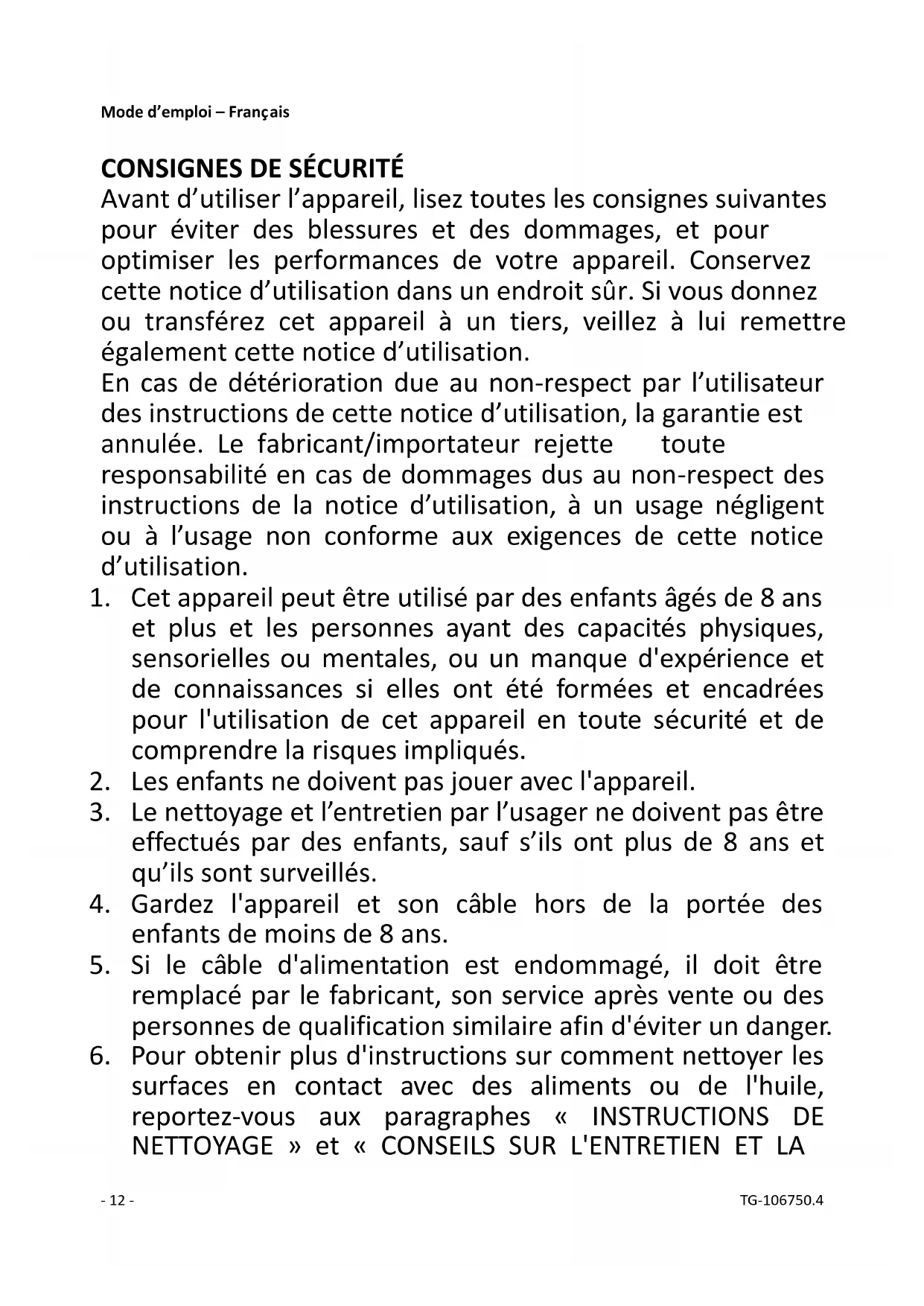 17. Ne laissez jamais l'appareil sans surveillance quand il est- 14 - TG-106750.4