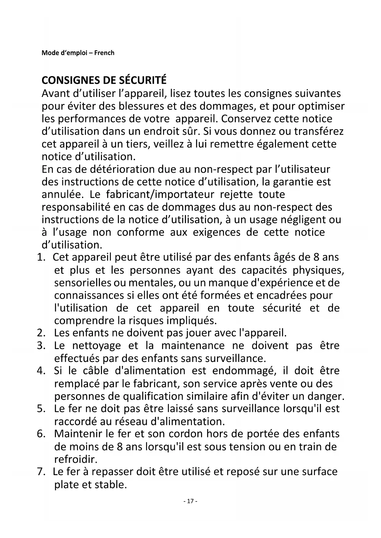 Avant d’utiliser l’appareil, lisez toutes les consignes suivantes pour éviter des blessures et des dommages, et pour optimiser les performances de votre appareil. Conservez cette notice d’utilisation dans un endroit sûr. Si vous donnez ou transférez cet appareil à un tiers, veillez à lui remettre également cette notice d’utilisation. En cas de détérioration due au non-respect par l’utilisateur des instructions de cette notice d’utilisation, la garantie est annulée. Le fabricant/importateur rejette toute responsabilité en cas de dommages dus au non-respect des instructions de la notice d’utilisation, à un usage négligent ou à l’usage non conforme aux exigences de cette notice d’utilisation.
