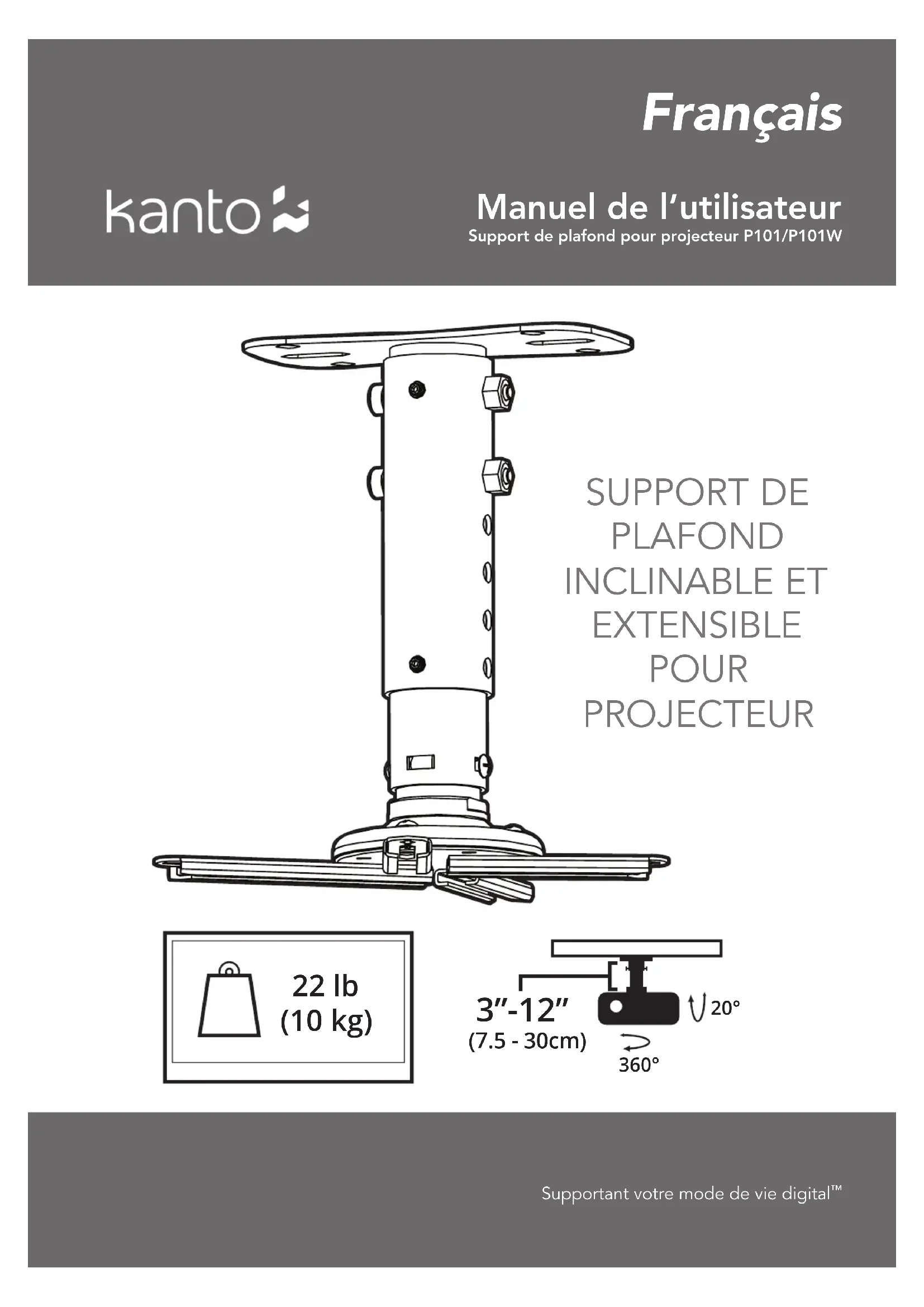 Merci d’avoir choisi un support universel de plafond pour projecteur par Kanto. Les P101 et P101W sont conçus pour monter des projecteurs de TV pesant jusqu’à 22 lbs (10 kg). Cet emballage permet l’installation de 3” (7,5cm) du plafond ou entre 9” et 12” (22,5 à 30 cm) à l’aide des tubes d’extension fournis. Le P101 et le P101W permettent une rotation de 360° et une inclinaison de 20°. Lisez ces instructions avant d’installer le support. Si vous ne comprenez pas ces instructions ou vous avez des doutes quant à la sécurité de l’installation, s’il vous plaît consultez un installateur qualifié pour installer ce support. Assurez-vous qu’il n’y a pas de pièces défectueuses ou manquantes. N’utilisez pas les pièces défectueuses. Si il manque du matériel, ou si vous n’êtes pas certain si la partie est défectueux, appellez Kanto directement au 1-888-848-2643 ou par courriel à support@kantoliving.com. Kanto ne peut pas être responsable pour des dommages matériels ou des blessures causés par un montage, assemblage, manipulation ou utilisation incorrecte de ce produit. ATTENTION Le poids de chargement maximale est de 22 lbs (10 kg). Ce support de plafond est conçu pour être utilisé uniquement avec les poids maximaux indiqués. Utilisation avec les produits plus lourds que les poids maximaux indiqués peut causer une instabilité et des blessures. ATTENTION Le plafond que vous prévoyez d’installer ce Kanto support doit être en mesure de supporter plus de 4 fois le poids du projecteur et le support combinés. N’utilisez pas ce produit pour tout autre but que de monter un projecteur sur une surface jusqu’à 20º de horizontal, tel qu’expliqué dans ce manuel. Une mauvaise installation peut causer des dommages à votre projecteur ou de blessure grave. Ce produit ne doit pas être monté sur les plafonds suspendus, blocs de béton ou des vieux plafonds en béton. Consultez un installateur qualifié si vous n’êtes pas sûr du type de plafond que vous pourriez avoir. Regarder la video d’installation en ligne à: www.kantoliving.com Visitez notre site web pour la version la plus récente de ce manuel.M2.5 x 15mm (avec rondelles)M3 x 15mm (avec rondelles)M3 x 20mm (avec rondelles)M4 x 15mmM4 x 20mmM4 x 25mmM5 x 15mmM5 x 20mmM5 x 25mmM6 x 15mmM6 x 20mmM6 x 25mm