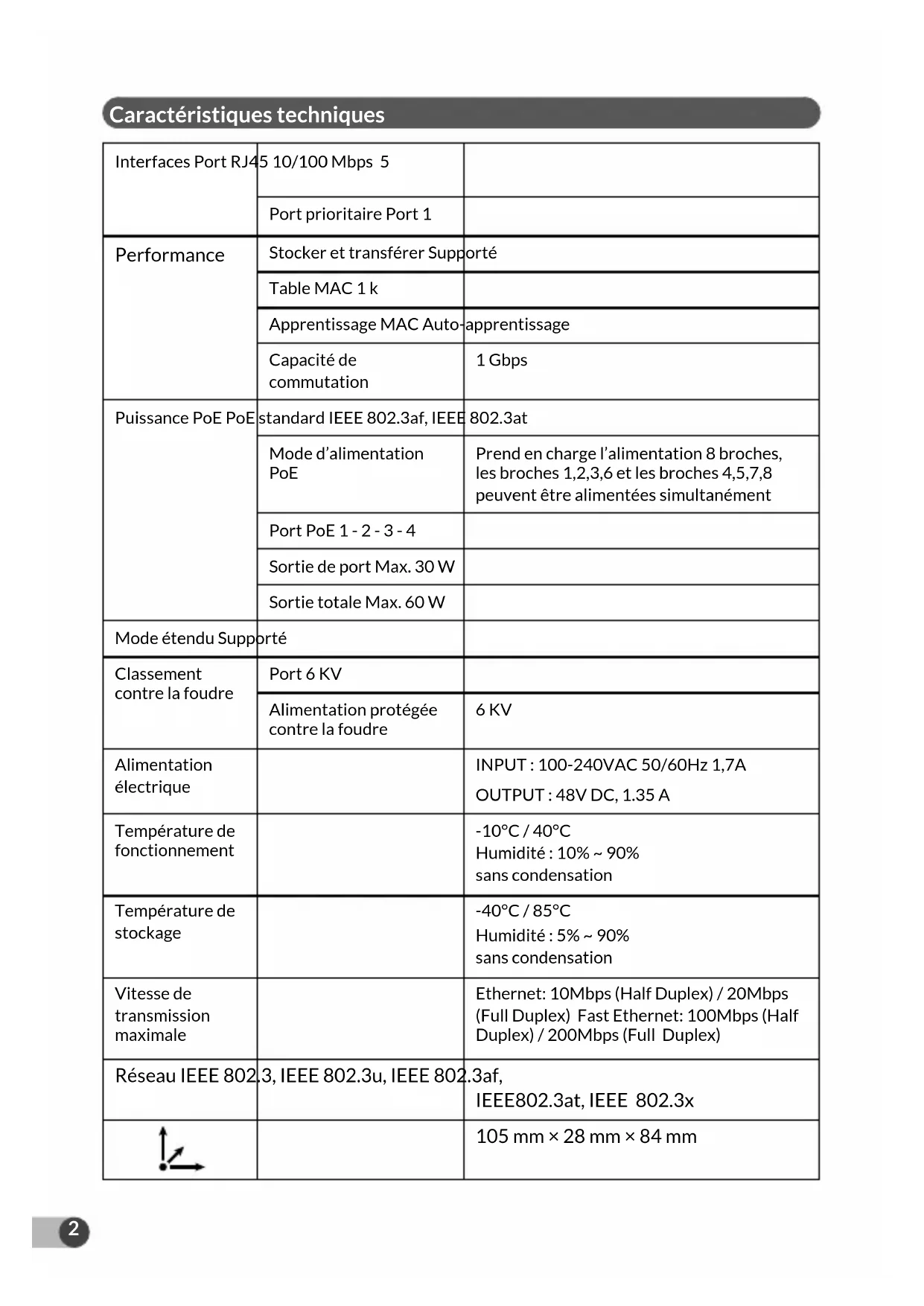 Asennusopas2 Caractéristiques techniques Interfaces Port RJ45 10/100 Mbps 5 Port prioritaire Port 1 Performance Stocker et transférer Supporté Table MAC 1 k Apprentissage MAC Auto-apprentissage Capacité de commutation 1 Gbps Puissance PoE PoE standard IEEE 802.3af, IEEE 802.3at Mode d’alimentation PoE Prend en charge l’alimentation 8 broches, les broches 1,2,3,6 et les broches 4,5,7,8 peuvent être alimentées simultanément Port PoE 1 - 2 - 3 - 4 Sortie de port Max. 30 W Sortie totale Max. 60 W Mode étendu Supporté Classement contre la foudre Port 6 KV Alimentation protégée contre la foudre 6 KV Alimentation électrique INPUT : 100-240VAC 50/60Hz 1,7A