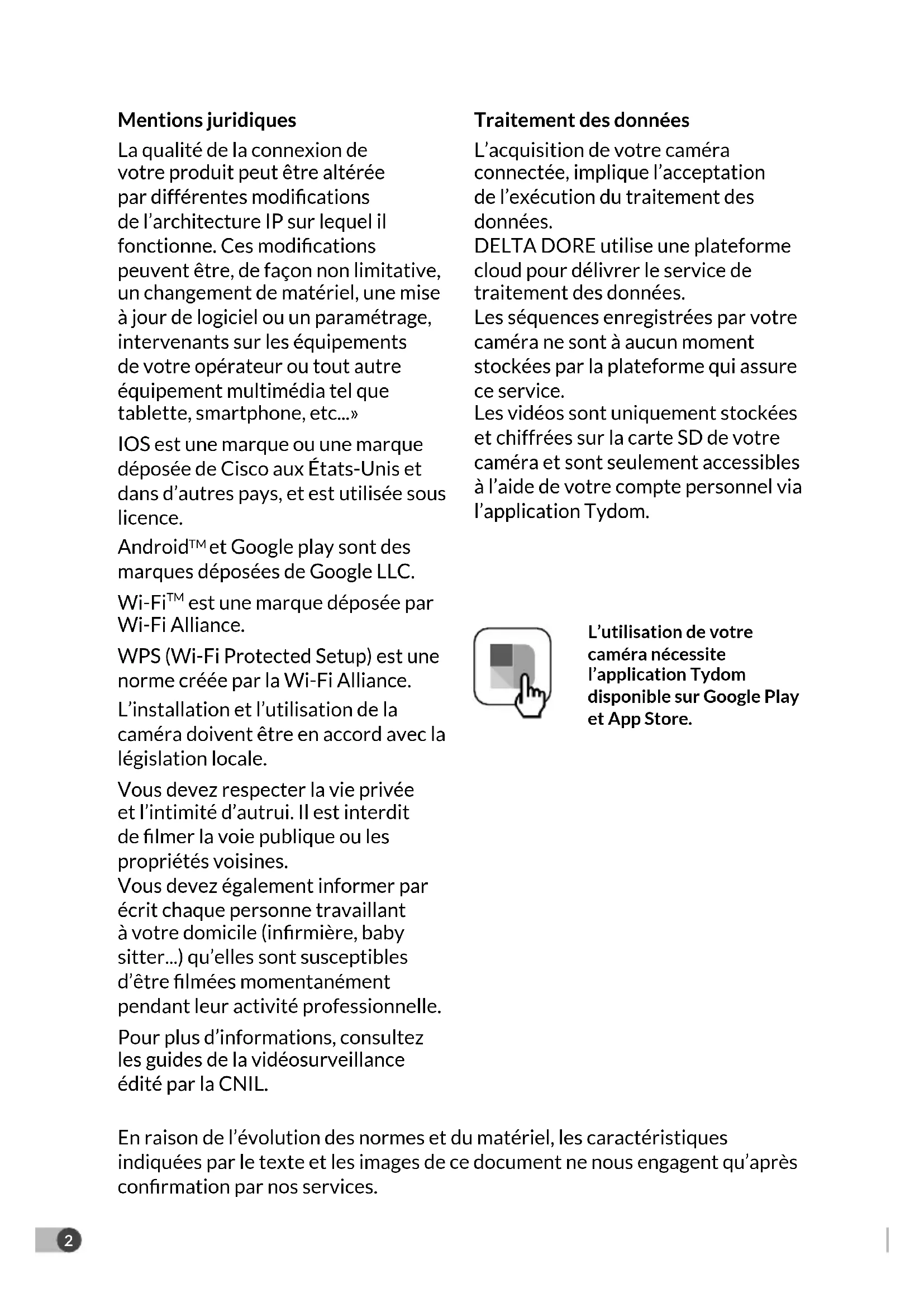 est une marque déposée par Wi-Fi Alliance. WPS (Wi-Fi Protected Setup) est une norme créée par la Wi-Fi Alliance. L’installation et l’utilisation de la caméra doivent être en accord avec la législation locale. Vous devez respecter la vie privée et l’intimité d’autrui. Il est interdit de lmer la voie publique ou les propriétés voisines. Vous devez également informer par écrit chaque personne travaillant à votre domicile (inrmière, baby sitter...) qu’elles sont susceptibles d’être lmées momentanément pendant leur activité professionnelle. Pour plus d’informations, consultez les guides de la vidéosurveillance édité par la CNIL. Traitement des données L’acquisition de votre caméra connectée, implique l’acceptation de l’exécution du traitement des données. DELTA DORE utilise une plateforme cloud pour délivrer le service de traitement des données. Les séquences enregistrées par votre caméra ne sont à aucun moment stockées par la plateforme qui assure ce service. Les vidéos sont uniquement stockées et chiffrées sur la carte SD de votre caméra et sont seulement accessibles à l’aide de votre compte personnel via l’application Tydom. L’utilisation de votre caméra nécessite l’application Tydom disponible sur Google Play et App Store. En raison de l’évolution des normes et du matériel, les caractéristiques indiquées par le texte et les images de ce document ne nous engagent qu’après conrmation par nos services.3