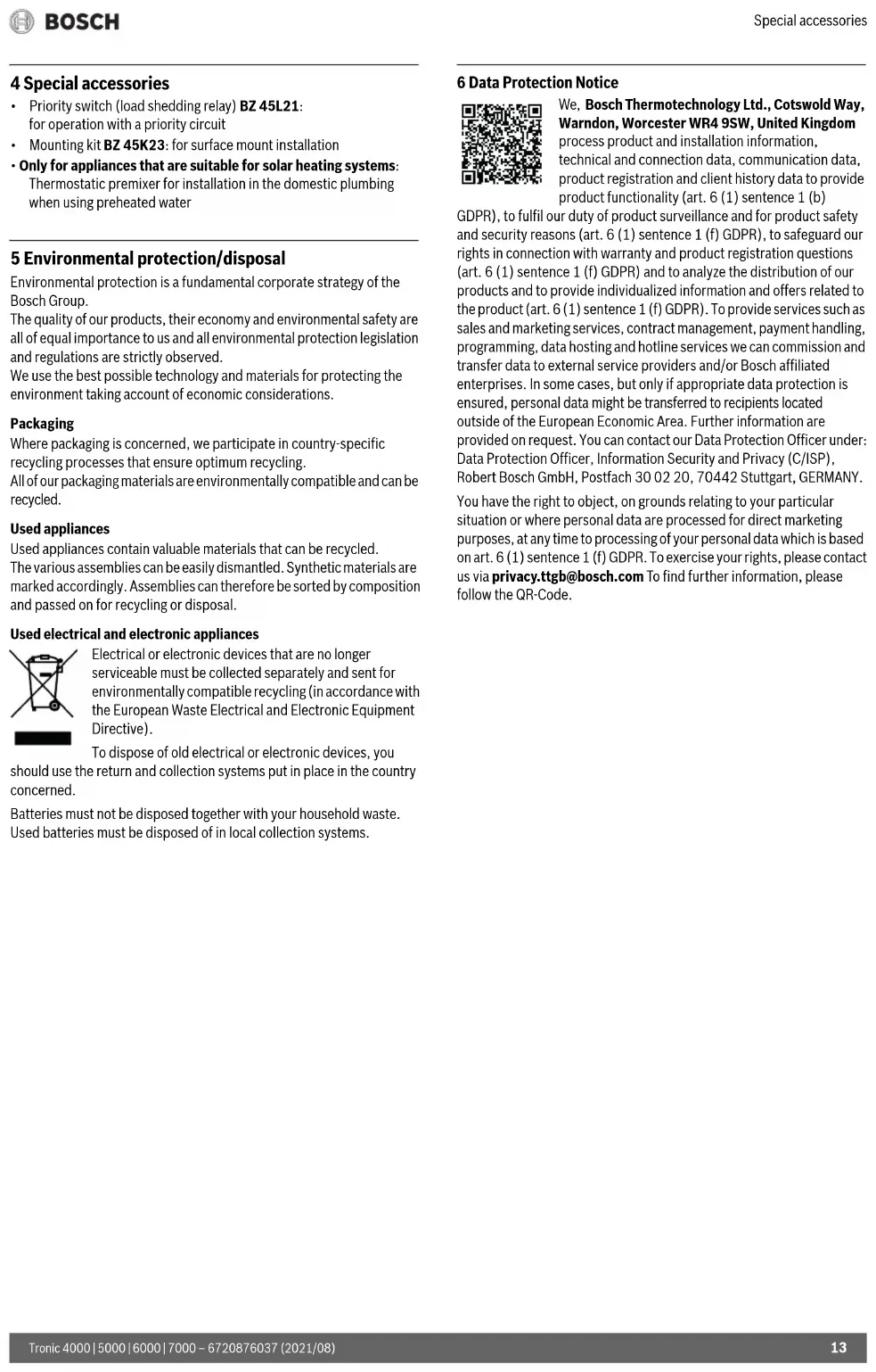 - Uniquement pour appareils appropriés pour le mode solaire : Prémélangeur à thermostat pour le montage dans l’installation domestique lors de l’utilisation de l’eau préchauffée 5 Protection de l’environnement/Recyclage La protection de l’environnement est un principe de base du groupe Bosch. Nous accordons une importance égale à la qualité de nos produits, à leur rentabilité et à la protection de l’environnement. Les lois et prescriptions concernant la protection de l’environnement sont strictement obser- vées. Pour la protection de l’environnement, nous utilisons, tout en respectant les aspects économiques, les meilleurs technologies et matériaux pos- sibles. Emballages En matière d’emballages, nous participons aux systèmes de mise en valeur spécifiques à chaque pays, qui visent à garantir un recyclage opti- mal. Tous les matériaux d’emballage utilisés respectent l’environnement et sont recyclables. Appareils usagés Les appareils usés contiennent des matériaux qui peuvent être réutili- sés. Les composants se détachent facilement. Les matières synthétiques sont marquées. Ceci permet de trier les différents composants en vue de leur recyclage ou de leur élimination. Appareils électriques et électroniques usagés Les appareils électriques et électroniques hors d'usage doivent être collectés séparément et soumis à une élimi- nation écologique (directive européenne sur les appareils usagés électriques et électroniques). Pour l'élimination des appareils électriques et électro- niques usagés, utiliser les systèmes de renvoi et de col- lecte spécifiques au pays. Les batteries ne doivent pas être recyclées avec les ordures ménagères. Les batteries usagées doivent être collectées dans les systèmes de col- lecte locale. 6 Déclaration de protection des données Nous, [FR] elm.leblanc S.A.S., 124-126 rue de Sta- lingrad, 93711 Drancy Cedex, France, [BE] Bosch Thermotechnology n.v./s.a., Zandvoortstraat 47, 2800 Mechelen, Belgique, [LU] Ferroknepper Buderus S.A., Z.I. Um Monkeler, 20, Op den Drieschen, B.P. 201 L-4003 Esch-sur-Alzette, Luxembourg, traitons les informations relatives au produit et à son ins- tallation, l’enregistrement du produit et les données de l’historique du client pour assurer la fonctionnalité du produit (art. 6 (1) phrase 1 (b) du RGPD), pour remplir notre mission de surveillance et de sécurité du pro- duit (art. 6 (1) phrase 1 (f) GDPR), pour protéger nos droits en matière de garantie et d’enregistrement de produit (art. 6 (1) phrase 1 (f) du RGPD), pour analyser la distribution de nos produits et pour fournir des informations et des offres personnalisées en rapport avec le produit (art. 6 (1) phrase 1 (f) du RGPD). Pour fournir des services tels que les ser- vices de vente et de marketing, la gestion des contrats, le traitement des paiements, la programmation, l’hébergement de données et les services d’assistance téléphonique, nous pouvons exploiter les données et les transférer à des prestataires de service externes et/ou à des entreprises affiliées à Bosch. Dans certains cas, mais uniquement si une protection des données appropriée est assurée, les données à caractère personnel peuvent être transférées à des destinataires en dehors de l’Espace éco- nomique européen. De plus amples informations sont disponibles sur demande. Vous pouvez contacter notre responsable de la protection des données à l’adresse suivante : Data Protection Officer, Information Secu- rity and Privacy (C/ISP), Robert Bosch GmbH, Postfach 30 02 20, 70442 Stuttgart, ALLEMAGNE. Vous avez le droit de vous opvposer à tout moment au traitement de vos données à caractère personnel conformément à l’art. 6 (1) phrase 1 (f) du RGPD pour des motifs qui vous sont propres ou dans le cas où vos données personnelles sont utilisées à des fins de marketing direct. Pour exercer votre droit, contactez-nous via l’adresse [FR] pri- vacy.ttfr@bosch.com, [BE] privacy.ttbe@bosch.com, [LU] DPO@bosch.com. Pour de plus amples informations, veuillez scanner le QR code.Inhoudsopgave Tronic 4000 | 5000 | 6000 | 7000 – 6720876037 (2021/08)