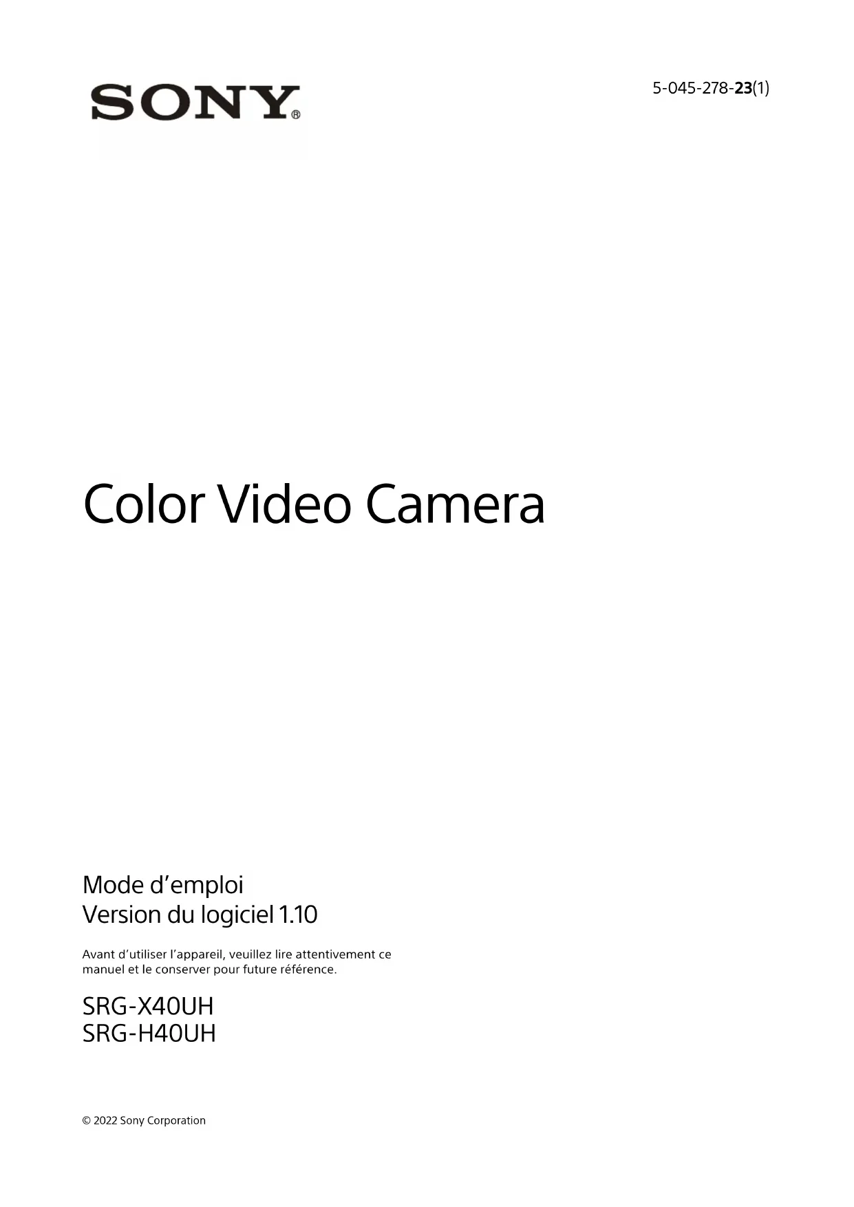 - Color Video Camera Mode d’emploi Version du logiciel 1.10 Avant d’utiliser l’appareil, veuillez lire attentivement ce manuel et le conserver pour future référence. SRG-X40UH SRG-H40UH 5-045-278-23(1) © 2022 Sony Corporation2 Table des matières Description générale Utilisation de ce manuel p. 4