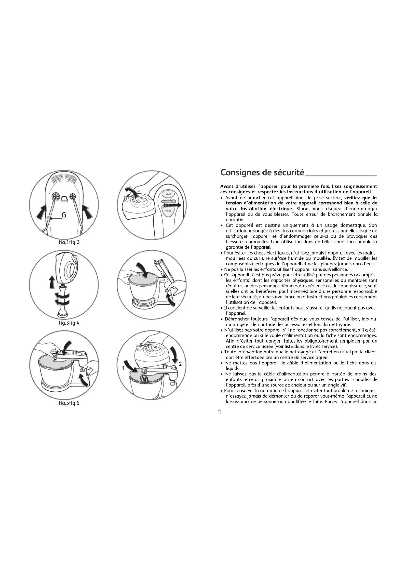 verrouillez. Les fouets et les malaxeurs ont une forme spécifique, le malaxeur ou le fouet avec le détrompeur (G) doit être mis à gauche, dans l’orifice le plus gros (Fig.1).