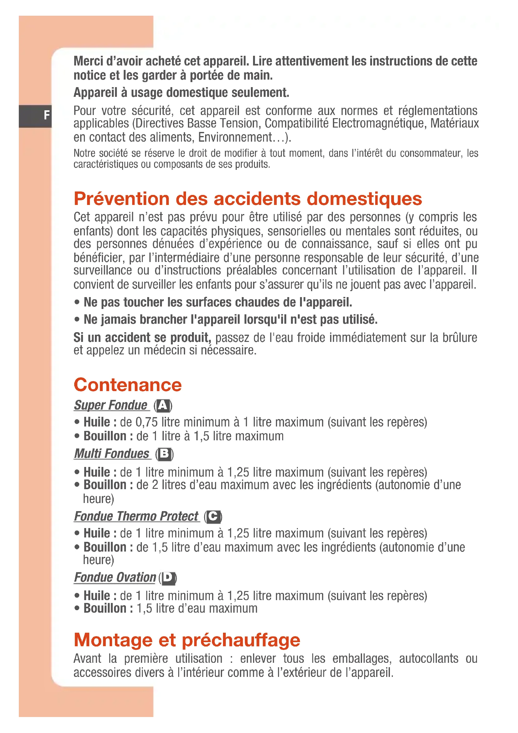 TsFondues 06-07 4/06/07 14:18 Page 3F Merci d’avoir acheté cet appareil. Lire attentivement les instructions de cette notice et les garder à portée de main. Appareil à usage domestique seulement. Pour votre sécurité, cet appareil est conforme aux normes et réglementations applicables (Directives Basse Tension, Compatibilité Electromagnétique, Matériaux en contact des aliments, Environnement…). Notre société se réserve le droit de modifier à tout moment, dans l’intérêt du consommateur, les caractéristiques ou composants de ses produits. Prévention des accidents domestiques Cet appareil n’est pas prévu pour être utilisé par des personnes (y compris les enfants) dont les capacités physiques, sensorielles ou mentales sont réduites, ou des personnes dénuées d’expérience ou de connaissance, sauf si elles ont pu bénéficier, par l’intermédiaire d’une personne responsable de leur sécurité, d’une surveillance ou d’instructions préalables concernant l’utilisation de l’appareil. Il convient de surveiller les enfants pour s’assurer qu’ils ne jouent pas avec l’appareil.