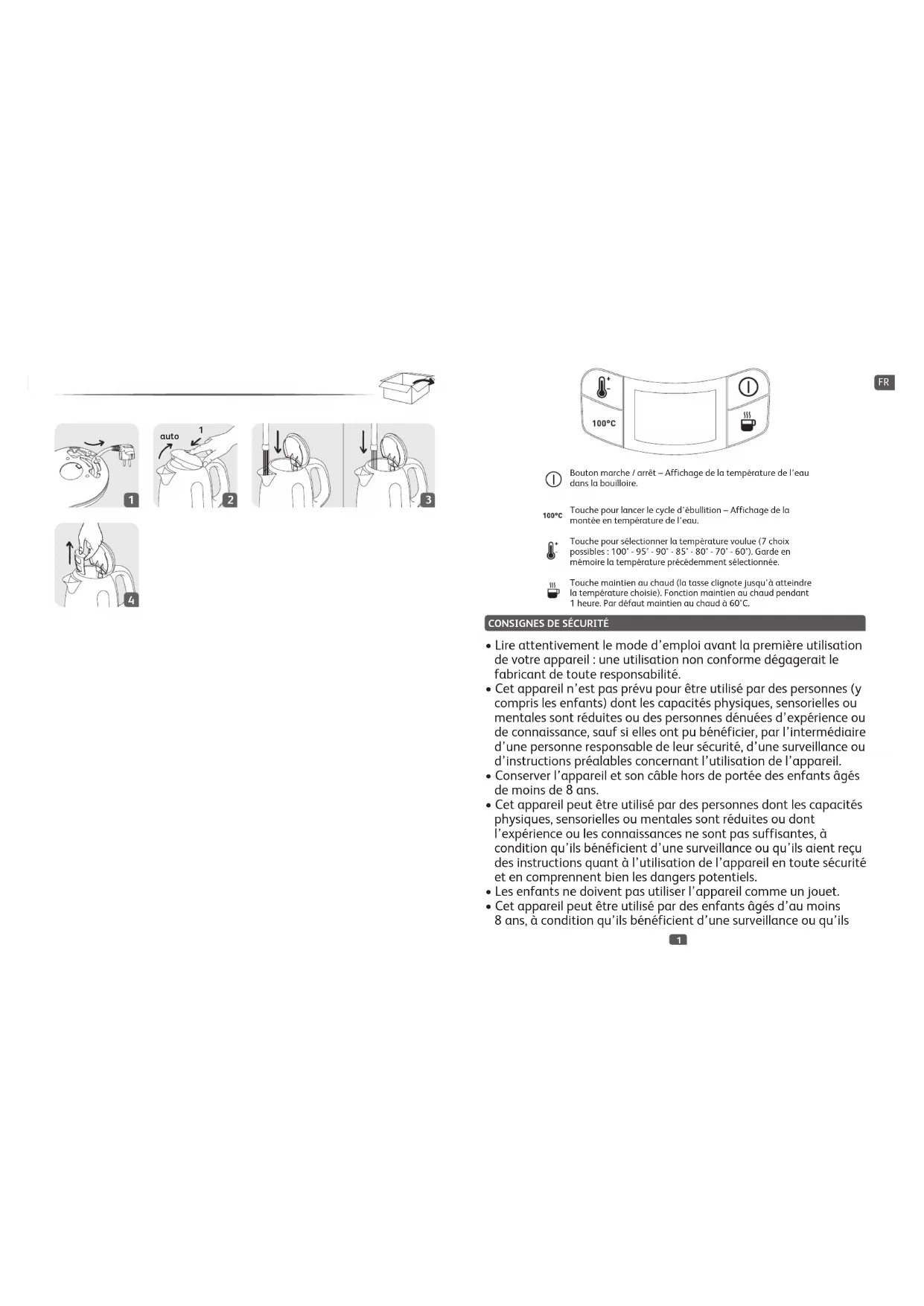 auto Bouton marche / arrêt – Affichage de la température de l’eau dans la bouilloire. Touche pour lancer le cycle d’ébullition – Affichage de la montée en température de l’eau. Touche pour sélectionner la température voulue (7 choix possibles : 100° - 95° - 90° - 85° - 80° - 70° - 60°). Garde en mémoire la température précédemment sélectionnée. Touche maintien au chaud (la tasse clignote jusqu’à atteindre la température choisie). Fonction maintien au chaud pendant 1 heure. Par défaut maintien au chaud à 60°C.32