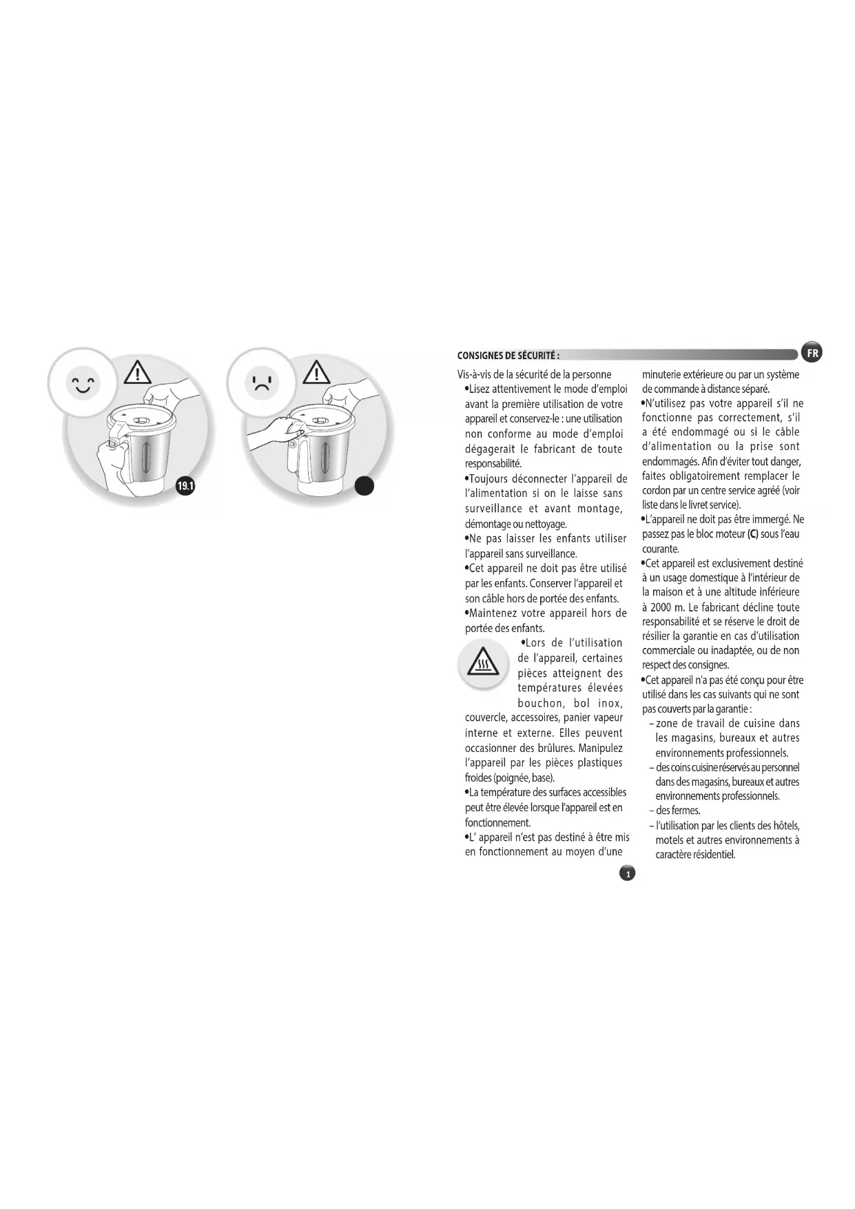 - Lors de l’utilisation de l’appareil, certaines pièces atteignent des températures élevées bouchon, bol inox, couvercle, accessoires, panier vapeur interne et externe. Elles peuvent occasionner des brûlures. Manipulez l’appareil par les pièces plastiques froides (poignée, base).
