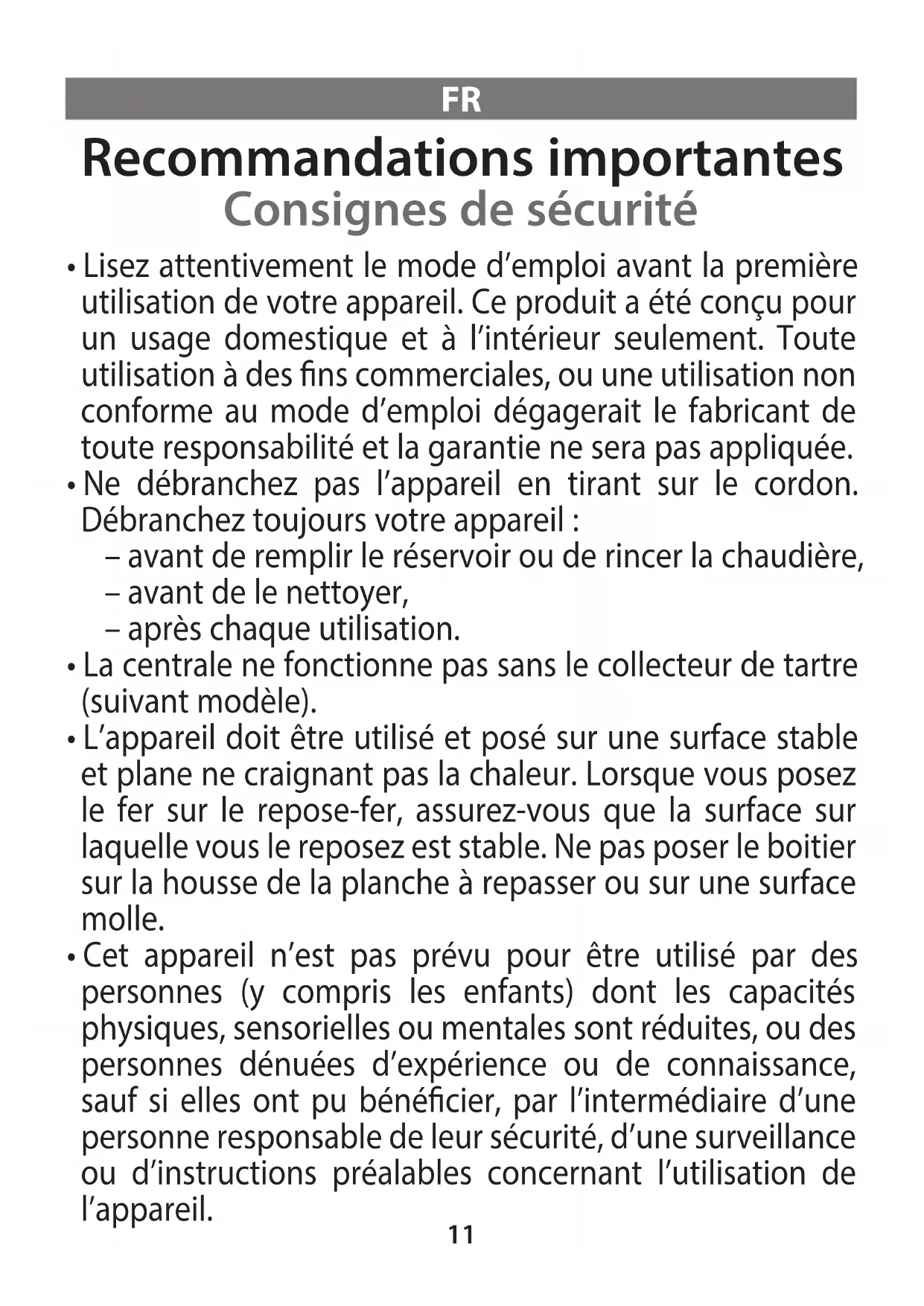 - Votre centrale vapeur est un appareil électrique: il doit être utilisé dans des conditions normales d’utilisation.