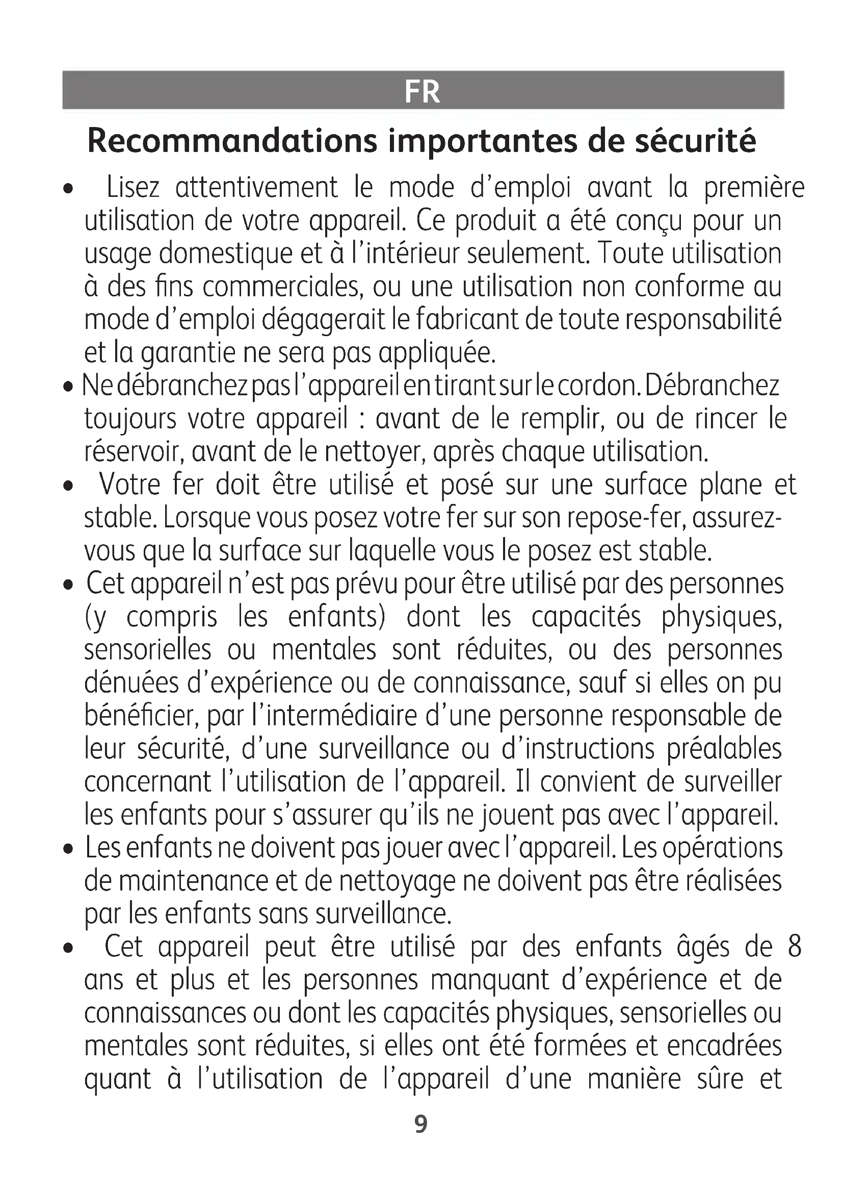 - Cet appareil peut être utilisé par des enfants âgés de 8 ans et plus et les personnes manquant d’expérience et de connaissances ou dont les capacités physiques, sensorielles ou mentales sont réduites, si elles ont été formées et encadrées quant à l’utilisation de l’appareil d’une manière sûre etconnaissent les risques encourus. Les enfants ne doivent pas jouer avec l’appareil. Les enfants ne doivent ni nettoyer l’appareil ni s’occuper de son entretien sans surveillance. Gardez le fer et le cordon hors de la portée des enfants de moins de 8 ans lorsque le fer est sous tension ou en cours de refroidissement.