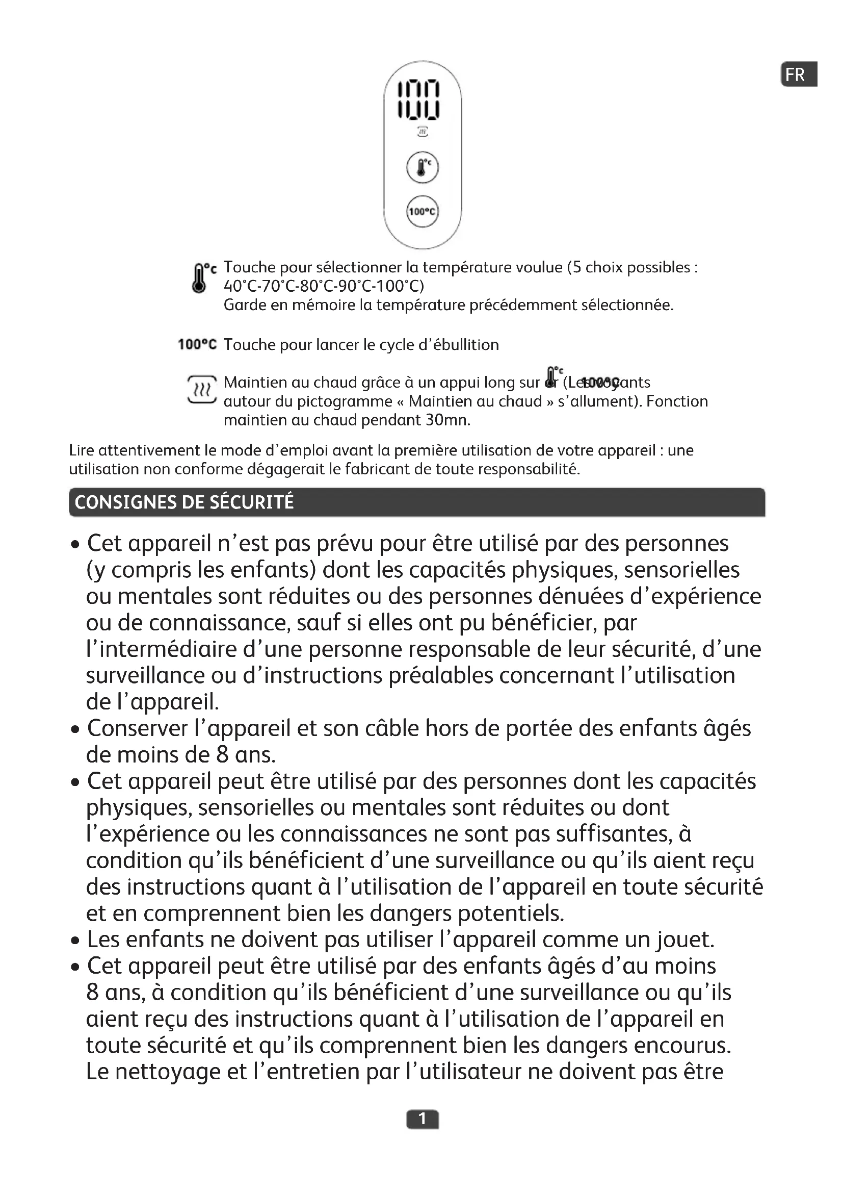Touche pour sélectionner la température voulue (5 choix possibles : 40°C-70°C-80°C-90°C-100°C) Garde en mémoire la température précédemment sélectionnée. Touche pour lancer le cycle d’ébullition Maintien au chaud grâce à un appui long sur or (Les voyants autour du pictogramme «Maintien au chaud» s’allument). Fonction maintien au chaud pendant 30mn.2 effectués par des enfants, à moins qu’ils ne soient âgés de plus de 8 ans et qu’ils soient sous la surveillance d’un adulte.