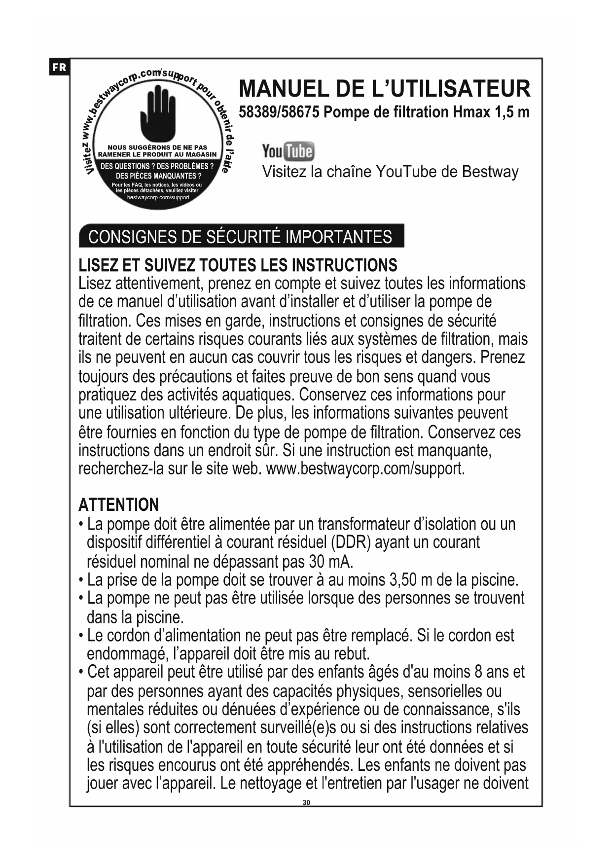 Lisez attentivement, prenez en compte et suivez toutes les informations de ce manuel d’utilisation avant d’installer et d’utiliser la pompe de filtration. Ces mises en garde, instructions et consignes de sécurité traitent de certains risques courants liés aux systèmes de filtration, mais ils ne peuvent en aucun cas couvrir tous les risques et dangers. Prenez toujours des précautions et faites preuve de bon sens quand vous pratiquez des activités aquatiques. Conservez ces informations pour une utilisation ultérieure. De plus, les informations suivantes peuvent être fournies en fonction du type de pompe de filtration. Conservez ces instructions dans un endroit sûr. Si une instruction est manquante, recherchez-la sur le site web. www.bestwaycorp.com/support. ATTENTION