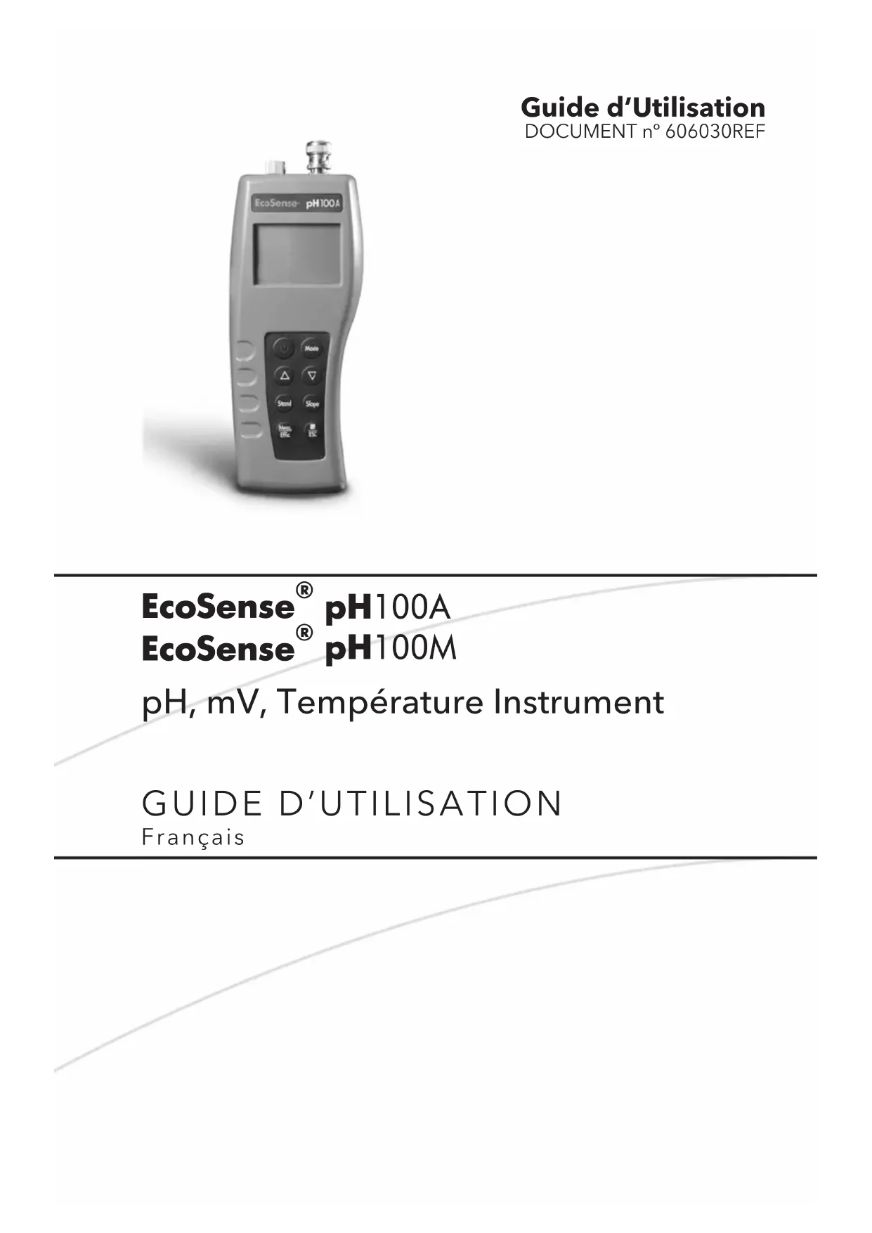 pH100M pH, mV, Température Instrument Guide d’Utilisation DOCUMENT nº 606030REFGARANTIE L'appareil EcoSense® pH100A/pH100M est garanti pour une période d'un an, à compter de la date d'achat par l'utilisateur final, contre tout défaut matériel et de fabrication. Les sondes et les câbles de l' pH100A/pH100M sont garantis pour une période de six mois, à compter de la date d'achat par l'utilisateur final, contre tout défaut matériel et de fabrication. Pendant la période de garantie, YSI s'engage à réparer ou à remplacer, gratuitement et à sa discrétion, tout produit qu'YSI peut établir comme étant couvert par la garantie. Pour faire valoir cette garantie, écrivez ou appelez votre représentant YSI ou contactez le Service clientèle d'YSI à Yellow Springs, Ohio, États-Unis. Envoyez le produit et son justificatif d'achat en port payé au Centre de service homologué sélectionné par YSI. La réparation ou le remplacement seront effectués et le produit vous sera retourné en port payé. Les produits réparés ou remplacés sont garantis jusqu'à expiration de la période de garantie originale ou pour au moins 90 jours, à compter de la date de réparation ou de remplacement. Limitation de garantie Cette garantie ne s'applique pas aux produits YSI endommagés ou présentant des dysfonctionnements pour les raisons suivantes : (i) installation, exploitation ou utilisation du produit d'une façon non conforme aux instructions écrites d'YSI ; (ii) abus ou mésusage du produit ; (iii) manquement à l'entretien du produit conformément aux instructions écrites d'YSI ou aux procédures industrielles normales ; (iv) réparation non conforme du produit ; (v) utilisation par vous de pièces ou de composants défectueux ou non conformes lors de l'entretien ou de la réparation du produit, ou ; (vi) modification du produit d'une façon non expressément autorisée par YSI. CETTE GARANTIE REMPLACE TOUTES LES AUTRES GARANTIES, EXPRESSES OU INDUITES, Y COMPRIS LES GARANTIES DE COMMERCIABILITÉ OU D'ADAPTATION À UN USAGE PARTICULIER. LA RESPONSABILITÉ D'YSI SELON LES TERMES DE CETTE GARANTIE SE LIMITE À LA RÉPARATION OU AU REMPLACEMENT DU PRODUIT, CONSTITUANT VOTRE SEUL ET UNIQUE RECOURS POUR TOUT PRODUIT DÉFECTUEUX COUVERT PAR CETTE GARANTIE. YSI NE POURRA EN AUCUN CAS ÊTRE TENU RESPONSABLE DE DOMMAGES SPÉCIAUX, INDIRECTS, ACCIDENTELS OU CONSÉCUTIFS RÉSULTANT DE L'UTILISATION DE TOUT PRODUIT DÉFECTUEUX COUVERT PAR CETTE GARANTIE.