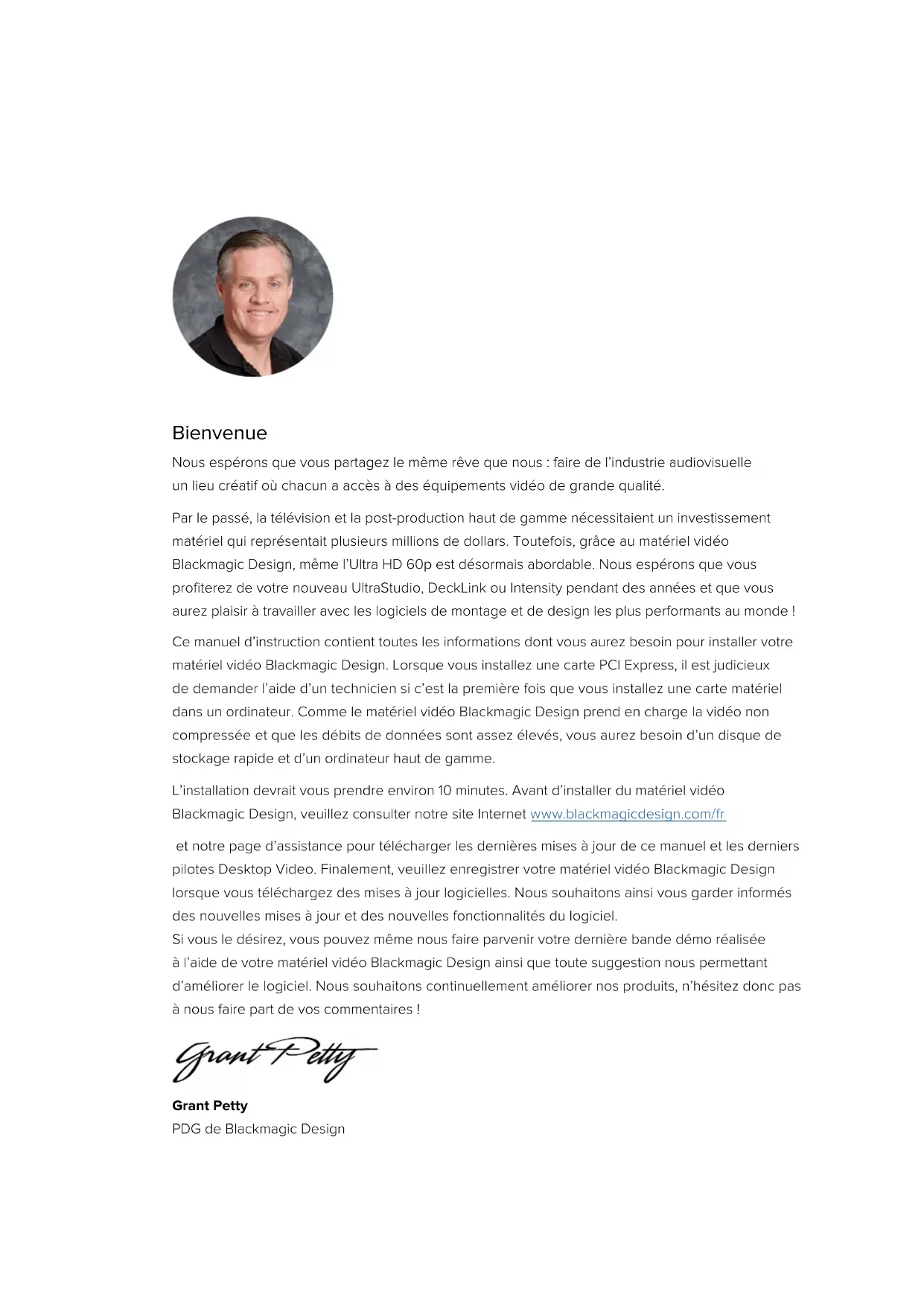 151Desktop Video DeckLink UltraStudio Intensity Juin 2022 Manuel d’installation et d’utilisationBienvenue Nous espérons que vous partagez le même rêve que nous : faire de l’industrie audiovisuelle un lieu créatif où chacun a accès à des équipements vidéo de grande qualité. Par le passé, la télévision et la post-production haut de gamme nécessitaient un investissement matériel qui représentait plusieurs millions de dollars. Toutefois, grâce au matériel vidéo Blackmagic Design, même l’Ultra HD 60p est désormais abordable. Nous espérons que vous profiterez de votre nouveau UltraStudio, DeckLink ou Intensity pendant des années et que vous aurez plaisir à travailler avec les logiciels de montage et de design les plus performants au monde ! Ce manuel d’instruction contient toutes les informations dont vous aurez besoin pour installer votre matériel vidéo Blackmagic Design. Lorsque vous installez une carte PCI Express, il est judicieux de demander l’aide d’un technicien si c’est la première fois que vous installez une carte matériel dans un ordinateur. Comme le matériel vidéo Blackmagic Design prend en charge la vidéo non compressée et que les débits de données sont assez élevés, vous aurez besoin d’un disque de stockage rapide et d’un ordinateur haut de gamme. L’installation devrait vous prendre environ 10 minutes. Avant d’installer du matériel vidéo Blackmagic Design, veuillez consulter notre site Internet www.blackmagicdesign.com/fr et notre page d’assistance pour télécharger les dernières mises à jour de ce manuel et les derniers pilotes Desktop Video. Finalement, veuillez enregistrer votre matériel vidéo Blackmagic Design lorsque vous téléchargez des mises à jour logicielles. Nous souhaitons ainsi vous garder informés des nouvelles mises à jour et des nouvelles fonctionnalités du logiciel. Si vous le désirez, vous pouvez même nous faire parvenir votre dernière bande démo réalisée à l’aide de votre matériel vidéo Blackmagic Design ainsi que toute suggestion nous permettant d’améliorer le logiciel. Nous souhaitons continuellement améliorer nos produits, n’hésitez donc pas à nous faire part de vos commentaires ! Grant Petty PDG de Blackmagic DesignSommaire Mise en route 155 Découvrir Desktop Video 155 Configuration système requise 155 Branchement à une source d’alimentation 155 Connecter du matériel vidéo 156 Installer le logiciel Desktop Video 160 Capturer et lire de la vidéo 165 Blackmagic Desktop Video Setup 166 Blackmagic Desktop Video Setup 166 Paramètres vidéo 168 Mappage de connecteurs pour DeckLink Quad 2 172 Paramètres Audio 173 Paramètre de conversion 175 Paramètres About 176 Teranex Mini Smart Panel 177 Installer un Teranex Mini Smart Panel 177 Caractéristiques du Smart Panel 179 Teranex Mini Rack Shelf 179 Utiliser le panneau avant del’UltraStudio4K Mini 180 DaVinci Resolve 181 Étalonnage en direct avec DaVinci Resolve 181 Montage avec DaVinci Resolve 182 Utiliser votre logiciel tiers favori 184 Adobe After Eects CC 184 Adobe Photoshop CC 186 Adobe Premiere Pro CC 187 Adobe Character Animator CC 192 Final Cut Pro X 193 Avid Media Composer 196 Blackmagic Media Express 203 Comprendre Blackmagic Media Express 203 Capturer des fichiers vidéo et audio 203 Lecture de fichiers vidéo et audio 208 Parcourir les médias 210 Monter des fichiers vidéo et audio sur bande 213 Capturer de la vidéo en H.265 214 Encodeur matériel H.265 215 Capturer de la vidéo H.265 avec UltraStudio 4K Extreme 215 Blackmagic Disk Speed Test 216 Retirer la carte mezzanine duDeckLink 4K Extreme 12G 219 Récupérer une mise à jour interrompuesur une carte DeckLink 220 Assistance 222 Informations pour les développeurs 223 Avis règlementaires 224 Informations de sécurité 225 Garantie 226 154Desktop VideoMise en route Découvrir Desktop Video Ce manuel vous guidera à travers la configuration système requise, l’installation du matériel et du logiciel Desktop Video, ainsi que la manière de les utiliser avec votre logiciel tiers de prédilection. Le logiciel inclut des pilotes, plug-ins et applications telles que Blackmagic Desktop Video Setup et Media Express pour une acquisition et une lecture rapides. Il fonctionne conjointement avec votre matériel UltraStudio, DeckLink, Intensity ou Teranex. Configuration système requise Votre ordinateur doit posséder au moins 4 GB de RAM pour traiter la vidéo de manière optimale. Mac OS Le logiciel Blackmagic Desktop Video est compatible avec les dernières versions de Mac OS. Windows Desktop Video fonctionne exclusivement sur les versions 64 bits de Windows 8 et 10 disposant des mises à jour Windows les plus récentes. Linux Desktop Video fonctionne avec les ordinateurs x86 64 bits sous Linux 2.6.23 ou version plus récente. Veuillez vous référer aux notes de mise à jour pour obtenir la liste la plus récente des distributions, formats de paquet et dépendances logicielles Linux compatibles. Branchement à une source d’alimentation Si votre matériel Desktop Video comprend une alimentation externe, connectez-la à l’appareil et mettez ce dernier en marche. 155Mise en routeCONSEIL Vous pouvez connecter la carte DeckLink 4K Extreme 12G à une autre source d’alimentation via le câble d’alimentation fourni. La carte DeckLink 4K Extreme 12G est très puissante et nous sommes continuellement à la recherche de moyens d’ajouter de nouvelles fonctionnalités, telles que des cartes mezzanines pour une meilleure connectivité. Grâce au câble d’alimentation, vous pourrez vous brancher à des sources d’alimentation additionnelles si votre carte DeckLink consomme plus d’énergie que ce que le logement PCIe de votre ordinateur peut fournir. S’il vous faut connecter une alimentation externe à votre DeckLink 4K Extreme 12G, utilisez le câble d’alimentation fourni. Il vous suffit de déconnecter le cordon d’alimentation de votre carte gra