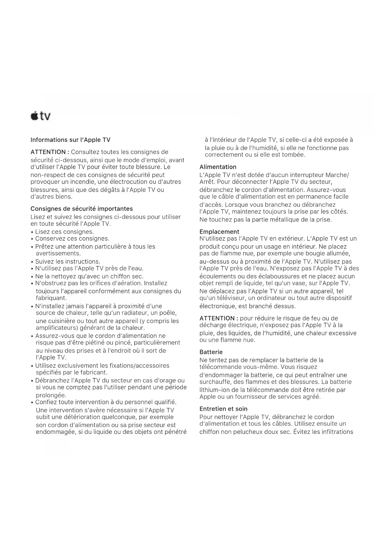 - Confiez toute intervention à du personnel qualifié. Une intervention s’avère nécessaire si l’AppleTV subit une détérioration quelconque, par exemple son cordon d’alimentation ou sa prise secteur est endommagée, si du liquide ou des objets ont pénétré à l’intérieur de l’AppleTV, si celle-ci a été exposée à la pluie ou à de l’humidité, si elle ne fonctionne pas correctement ou si elle est tombée. Alimentation L’AppleTV n’est dotée d’aucun interrupteur Marche/ Arrêt. Pour déconnecter l’AppleTV du secteur, débranchez le cordon d’alimentation. Assurez-vous que le câble d’alimentation est en permanence facile d’accès. Lorsque vous branchez ou débranchez l’AppleTV, maintenez toujours la prise par les côtés. Netouchez pas la partie métallique de la prise. Emplacement N’utilisez pas l’AppleTV en extérieur. L’AppleTV est un produit conçu pour un usage en intérieur. Ne placez pas de flamme nue, par exemple une bougie allumée, au-dessus ou à proximité de l’AppleTV. N’utilisez pas l’AppleTV près de l’eau. N’exposez pas l’AppleTV à des écoulements ou des éclaboussures et ne placez aucun objet rempli de liquide, tel qu’un vase, sur l’AppleTV. Ne déplacez pas l’AppleTV si un autre appareil, tel qu’un téléviseur, un ordinateur ou tout autre dispositif électronique, est branché dessus. ATTENTION: pour réduire le risque de feu ou de décharge électrique, n’exposez pas l’AppleTV à la pluie, des liquides, de l’humidité, une chaleur excessive ou une flamme nue. Batterie Ne tentez pas de remplacer la batterie de la télécommande vous-même. Vous risquez d’endommager la batterie, ce qui peut entraîner une surchauffe, des flammes et des blessures. La batterie lithium-ion de la télécommande doit être retirée par Apple ou un fournisseur de services agréé. Entretien et soin Pour nettoyer l’AppleTV, débranchez le cordon d’alimentation et tous les câbles. Utilisez ensuite un chiffon non pelucheux doux sec. Évitez les infiltrationsd’humidité dans les orifices de l’appareil. N’utilisez pas de produit de nettoyage de vitres, de détergent ménager, d’aérosol, de solvant, d’alcool, d’ammoniac ou de produit abrasif pour nettoyer l’AppleTV. Réparation Ne tentez pas de réparer le dispositif vous-même. Pour en savoir plus sur la réparation, consultez la page support.apple.com/fr-fr/apple-tv/repair/service. ATTENTION: n’essayez pas d’ouvrir ou de démonter l’AppleTV. Vous risquez une décharge électrique, et la dégradation consécutive au démontage n’est pas couverte par la garantie limitée. Aucune pièce interne n’est remplaçable par l’utilisateur. Manipulation Votre AppleTV est susceptible de s’endommager lors d’un stockage inadéquat ou une manipulation incorrecte. Prenez garde de ne pas faire tomber l’AppleTV au moment de la transporter. Environnement d’utilisation L’AppleTV donne son plein potentiel à des températures ambiantes comprises entre 0°C et 35°C et peut être stockée à des températures comprises entre –20°C et 45°C. Lors de l’utilisation de l’AppleTV, il est normal que son boîtier chauffe. Le boîtier de l’AppleTV est conçu pour dissiper vers l’extérieur la chaleur qui s’accumule àl’intérieur de l’unité. N’utilisez pas l’AppleTV dans des lieux avec des quantités significatives de poussière ou de particules en suspension susceptibles d’obstruer les orifices d’aération. Environnements explosifs et autres conditions atmosphériques L’utilisation de l’AppleTV et de la télécommande dans un environnement potentiellement explosif, telle qu’une zone où l’air contient un taux élevé de produits, de vapeurs ou de particules inflammables (par exemple des grains, de la poussière ou de la poudre métallique) peut s’avérer dangereux.L’exposition de l’AppleTV et de la télécommande à des environnements avec de fortes concentrations de produits chimiques industriels, notamment des gaz liquéfiés au point d’évaporation tels que l’hélium, est susceptible de détériorer ou de nuire au bon fonctionnement de l’AppleTV et de la télécommande. Respectez tous les signaux et consignes. Problèmes médicaux Si vous souffrez d’un problème médical sur lequel l’utilisation de l’AppleTV pourrait selon vous avoir des conséquences (par exemple attaque, évanouissement, fatigue visuelle ou maux de tête), consultez votre médecin avant d’utiliser l’AppleTV. Appareils médicaux La télécommande contient des composants radio qui émettent des champs électromagnétiques. Il se peut que ce champ électromagnétique interfère avec des stimulateurs cardiaques, des défibrillateurs et autres dispositifs médicaux. Conservez une distance d’environ 15cm au moins entre votre stimulateur cardiaque ou défibrillateur et la télécommande. Si vous soupçonnez que la télécommande interfère avec votre stimulateur cardiaque ou tout autre appareil médical, interrompez son utilisation et demandez à votre médecin des informations spécifiques à votre appareil médical. Mouvements répétés Lorsque vous réalisez des activités répétitives, telles que des jeux sur l’AppleTV, vous êtes susceptible d’éprouver une gêne occasionnelle dans les mains, les bras, les épaules, le cou ou d’autres parties du corps. Si vous éprouvez une gêne, cessez ces activités et consultez un médecin. Recharge de la télécommande Rechargez la télécommande à l’aide du câble Lightning fourni ou de tout autre câble Lightning «Made for iPhone» de tierce partie. L’utilisation de câbles ou de chargeurs contrefaits ou endommagés, ou la recharge dans un environnement humide, peut déclencher un feu, occasionner des décharges électriques, entraîner des blessures ou endommager la télécommande ou d’autres biens. Lorsque vous utilisez l’adaptateur secteur pour recharger la télécommande, vei