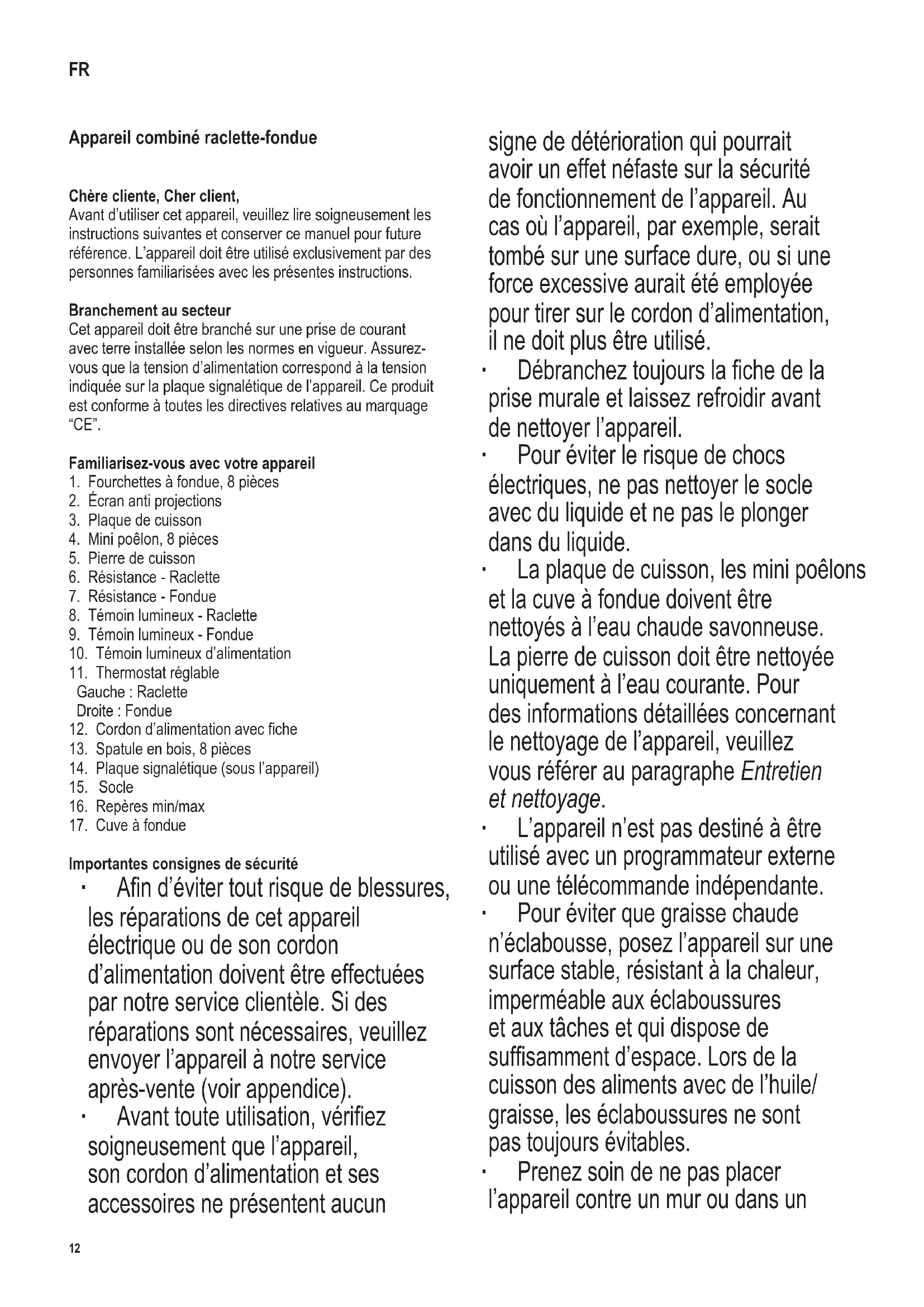 Importantes consignes de sécurité ∙ An d’éviter tout risque de blessures, les réparations de cet appareil électrique ou de son cordon d’alimentation doivent être effectuées par notre service clientèle. Si des réparations sont nécessaires, veuillez envoyer l’appareil à notre service après-vente (voir appendice). ∙ Avant toute utilisation, vériez soigneusement que l’appareil, son cordon d’alimentation et ses accessoires ne présentent aucun signe de détérioration qui pourrait avoir un effet néfaste sur la sécurité de fonctionnement de l’appareil. Au cas où l’appareil, par exemple, serait tombé sur une surface dure, ou si une force excessive aurait été employée pour tirer sur le cordon d’alimentation, il ne doit plus être utilisé. ∙ Débranchez toujours la che de la prise murale et laissez refroidir avant de nettoyer l’appareil. ∙ Pour éviter le risque de chocs électriques, ne pas nettoyer le socle avec du liquide et ne pas le plonger dans du liquide. ∙ La plaque de cuisson, les mini poêlons et la cuve à fondue doivent être nettoyés à l’eau chaude savonneuse. La pierre de cuisson doit être nettoyée uniquement à l’eau courante. Pour des informations détaillées concernant le nettoyage de l’appareil, veuillez vous référer au paragraphe Entretien et nettoyage. ∙ L’appareil n’est pas destiné à être utilisé avec un programmateur externe ou une télécommande indépendante. ∙ Pour éviter que graisse chaude n’éclabousse, posez l’appareil sur une surface stable, résistant à la chaleur, imperméable aux éclaboussures et aux tâches et qui dispose de sufsamment d’espace. Lors de la cuisson des aliments avec de l’huile/ graisse, les éclaboussures ne sont pas toujours évitables. ∙ Prenez soin de ne pas placer l’appareil contre un mur ou dans un FR13 142 x 208 mm angle, et de le tenir à l’écart de toute matière inammable. ∙ Cet appareil est destiné à être utilisé dans des applications domestiques et analogues telles que : - des coins cuisines réservés au personnel dans des magasins, bureaux et autres environnements professionnels ; - des fermes ; - l’utilisation par les clients des hôtels, motels et autres environnements à caractère résidentiel ; - des environnements de type chambres d’hôtes. ∙ Les enfants de moins de 8 ans ne sont pas autorisés à utiliser cet appareil. ∙ Cependant, les enfants âgés de 8 ans et plus peuvent utiliser l’appareil à condition d’être surveillés en permanence. ∙ L’appareil ne peut être utilisé par des personnes souffrant de déciences physiques, sensorielles ou mentales ou manquant d’expérience ou de connaissances, sauf si celles-ci ont été formées à l’utilisation de l’appareil et ont été supervisées, et si elles en comprennent les dangers et les précautions de sécurité à prendre. ∙ Les enfants ne sont pas autorisés à jouer avec l’appareil. ∙ Ne laissez pas les enfants nettoyer ou procéder à des travaux d’entretien ou de maintenance sur l’appareil. ∙ L’appareil et son cordon d’alimentation doivent être, à tout moment, tenus hors de portée des enfants de moins de 8 ans. ∙ Attention : Tenez les enfants à l’écart des emballages, qui représentent un risque potentiel, par exemple, de suffocation. ∙ Les surfaces de l’appareil ainsi que tous les accessoires deviennent chauds pendant l’utilisation et le restent ensuite pendant quelques temps. Attention : Risque de brûlure. ∙ L’appareil doit être mis en marche uniquement lorsque la plaque de cuisson est correctement installée, et, soit la pierre de cuisson, soit la cuve à fondue, posée sur la plaque. ∙ Les aliments congelés ne doivent jamais être utilisés pour la cuisson au gril ou pour préparer une fondue, mais doivent d’abord être décongelés et, si nécessaire, essuyés. ∙ Ne placez sur la pierre aucun aliment surgelé ni aliment contenant du vinaigre (tel que cornichon au vinaigre ou moutarde). ∙ Cette pierre est constituée de matière naturelle. L’apparition de très nes ssures dues à l’expansion et la contraction pendant la cuisson, ainsi que la coloration plus marquée de la pierre, sont des phénomènes normaux sans effets préjudiciables. ∙ Pour éviter d’endommager le revêtement de la plaque de cuisson et des mini poêlons lors du retrait des aliments, utilisez uniquement des ustensiles non abrasifs. ∙ L’huile/matière grasse risque de s’enammer quand elle est surchauffée. Dans ce cas, retirez la che de la prise, puis posez un couvercle ou autre objet en métal sur le poêlon an d’étouffer les ammes. ∙ Ne versez jamais d’eau sur de l’huile/graisse chaude en ammes! ∙ Attention : Ne déplacez jamais l’appareil lorsqu’il est chaud, c.-à-d. en cours d’utilisation ou juste après utilisation. Soyez extrêmement prudent: l’huile/graisse chaude peut donner lieu à de graves brûlures. ∙ Utilisez la cuve à fondue uniquement avec le socle fourni. ∙ Débranchez toujours la che de la prise murale - après utilisation, - en cas de fonctionnement défectueux, - lorsque l’appareil fonctionne sans surveillance, - avant de nettoyer l’appareil. ∙ Ne pas débrancher l’appareil en tirant sur le cordon ; tirez toujours sur la che. ∙ Nous déclinons toute responsabilité pour les dommages éventuels subis par cet appareil, résultant d’une utilisation incorrecte ou du non-respect de ce mode d’emploi.14 142 x 208 mm Fonctionnement Avant la première mise en marche ∙ Retirez tous les éléments d’emballage et les autocollants de l’appareil. ∙ Avant d’utiliser l’appareil pour la première fois, nettoyez toutes les pièces avec un chiffon humide. ∙ Faites chauffer l’appareil, ainsi que les mini poêlons, la plaque de cuisson et la pierre de cuisson, pendant environ 10 minutes, sans aucun aliment, pour éliminer l’odeur caractéristique qui se dégage d’un