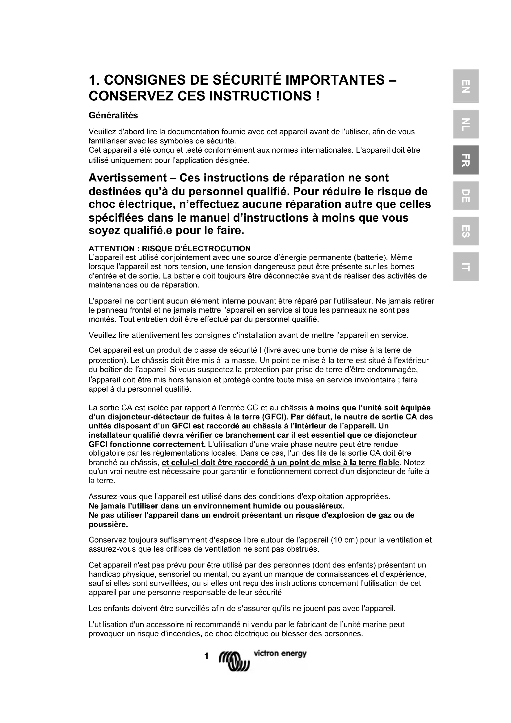 L’appareil est utilisé conjointement avec une source d’énergie permanente (batterie). Même lorsque l'appareil est hors tension, une tension dangereuse peut être présente sur les bornes d'entrée et de sortie. La batterie doit toujours être déconnectée avant de réaliser des activités de maintenances ou de réparation. L'appareil ne contient aucun élément interne pouvant être réparé par l’utilisateur. Ne jamais retirer le panneau frontal et ne jamais mettre l'appareil en service si tous les panneaux ne sont pas montés. Tout entretien doit être effectué par du personnel qualifié. Veuillez lire attentivement les consignes d'installation avant de mettre l'appareil en service. Cet appareil est un produit de classe de sécurité I (livré avec une borne de mise à la terre de protection). Le châssis doit être mis à la masse. Un point de mise à la terre est situé à l’extérieur du boîtier de l’appareil Si vous suspectez la protection par prise de terre d’être endommagée, l’appareil doit être mis hors tension et protégé contre toute mise en service involontaire ; faire appel à du personnel qualifié. La sortie CA est isolée par rapport à l'entrée CC et au châssis à moins que l’unité soit équipée d’un disjoncteur-détecteur de fuites à la terre (GFCI). Par défaut, le neutre de sortie CA des unités disposant d’un GFCI est raccordé au châssis à l’intérieur de l’appareil. Un installateur qualifié devra vérifier ce branchement car il est essentiel que ce disjoncteur GFCI fonctionne correctement. L'utilisation d'une vraie phase neutre peut être rendue obligatoire par les réglementations locales. Dans ce cas, l'un des fils de la sortie CA doit être branché au châssis, et celui-ci doit être raccordé à un point de mise à la terre fiable. Notez qu'un vrai neutre est nécessaire pour garantir le fonctionnement correct d'un disjoncteur de fuite à la terre. Assurez-vous que l'appareil est utilisé dans des conditions d'exploitation appropriées. Ne jamais l'utiliser dans un environnement humide ou poussiéreux. Ne pas utiliser l'appareil dans un endroit présentant un risque d'explosion de gaz ou de poussière. Conservez toujours suffisamment d'espace libre autour de l'appareil (10 cm) pour la ventilation et assurez-vous que les orifices de ventilation ne sont pas obstrués. Cet appareil n'est pas prévu pour être utilisé par des personnes (dont des enfants) présentant un handicap physique, sensoriel ou mental, ou ayant un manque de connaissances et d'expérience, sauf si elles sont surveillées, ou si elles ont reçu des instructions concernant l'utilisation de cet appareil par une personne responsable de leur sécurité. Les enfants doivent être surveillés afin de s'assurer qu'ils ne jouent pas avec l'appareil. L'utilisation d'un accessoire ni recommandé ni vendu par le fabricant de l’unité marine peut provoquer un risque d'incendies, de choc électrique ou blesser des personnes.2