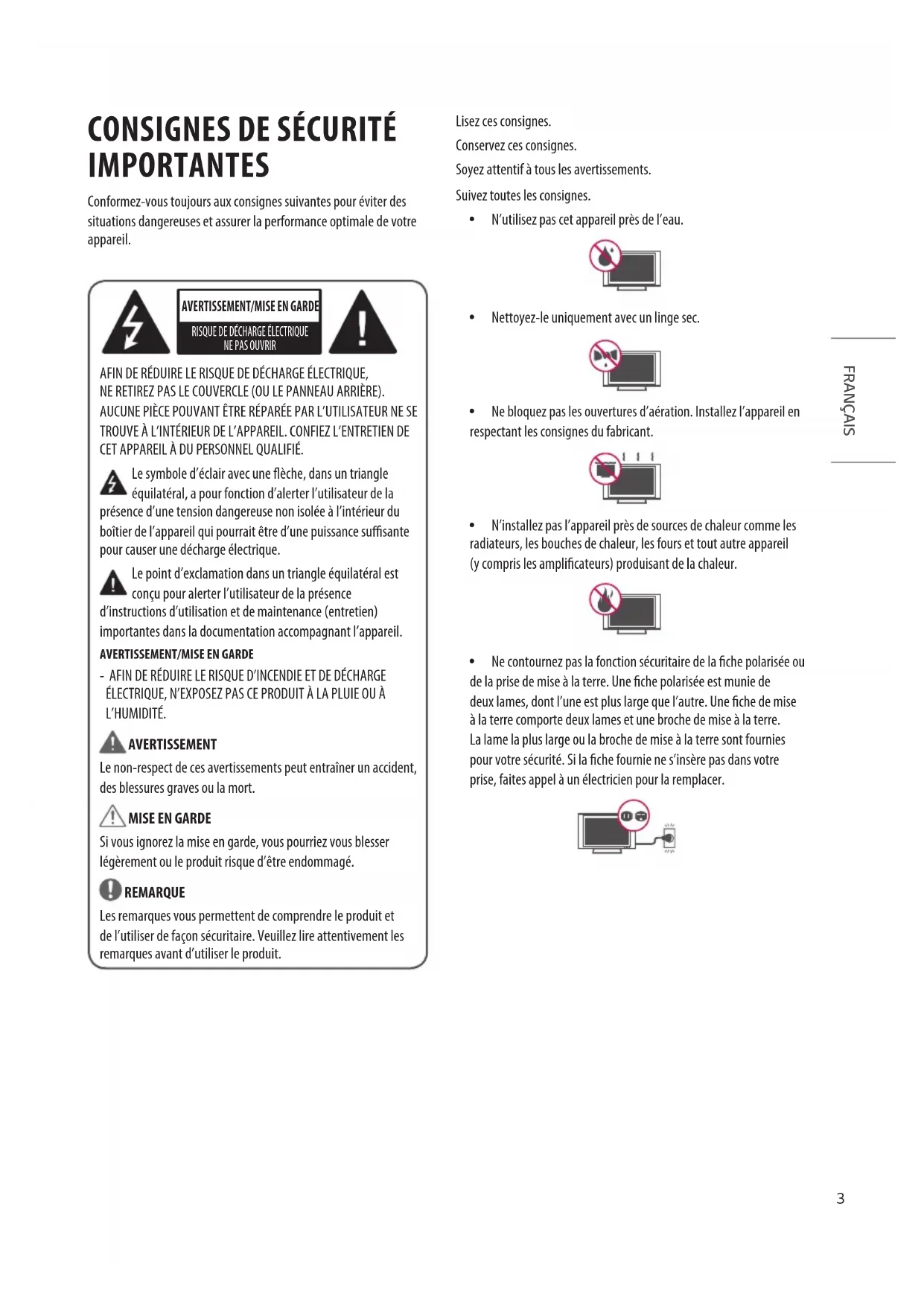 Si vous ignorez la mise en garde, vous pourriez vous blesser légèrement ou le produit risque d’être endommagé. REMARQUE Les remarques vous permettent de comprendre le produit et de l’utiliser de façon sécuritaire. Veuillez lire attentivement les remarques avant d’utiliser le produit. Lisez ces consignes. Conservez ces consignes. Soyez attentif à tous les avertissements. Suivez toutes les consignes. y N’utilisez pas cet appareil près de l’eau. y Nettoyez-le uniquement avec un linge sec. y Ne bloquez pas les ouvertures d’aération. Installez l’appareil en respectant les consignes du fabricant. y N’installez pas l’appareil près de sources de chaleur comme les radiateurs, les bouches de chaleur, les fours et tout autre appareil (y compris les amplicateurs) produisant de la chaleur. y Ne contournez pas la fonction sécuritaire de la che polarisée ou de la prise de mise à la terre. Une che polarisée est munie de deux lames, dont l’une est plus large que l’autre. Une che de mise à la terre comporte deux lames et une broche de mise à la terre. La lame la plus large ou la broche de mise à la terre sont fournies pour votre sécurité. Si la che fournie ne s’insère pas dans votre prise, faites appel à un électricien pour la remplacer.