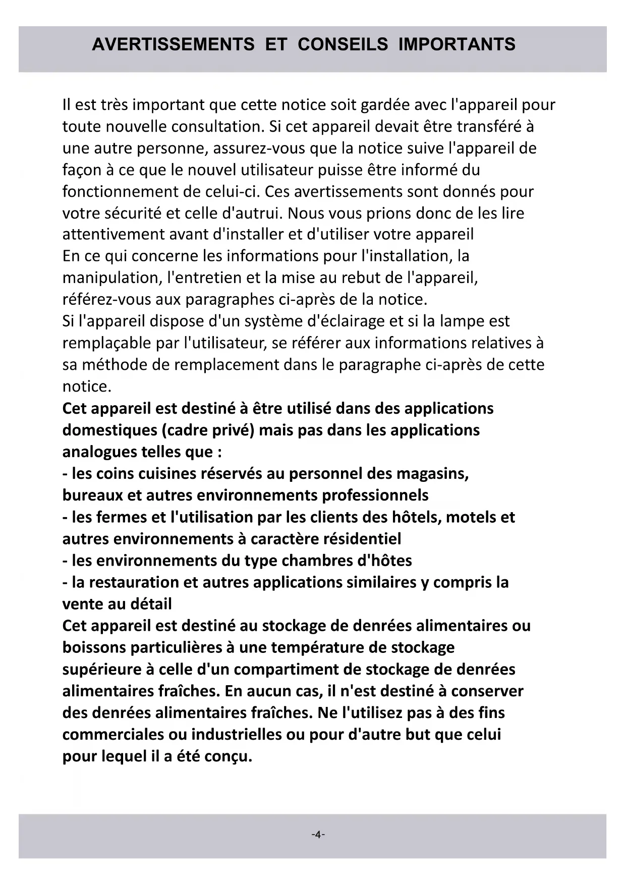 -3-Ilesttrèsimportantquecettenoticesoitgardéeavecl'appareilpour toutenouvelleconsultation.Sicetappareildevaitêtretransféréà uneautrepersonne,assurez‐vousquelanoticesuivel'appareilde façonàcequelenouvelutilisateurpuisseêtreinformédu fonctionnementdecelui‐ci.Cesavertissementssontdonnéspour votresécuritéetcelled'autrui.Nousvousprionsdoncdeleslire attentivementavantd'installeretd'utiliservotreappareil Encequiconcernelesinformationspourl'installation,la manipulation,l'entretienetlamiseaurebutdel'appareil, référez‐vousauxparagraphesci‐aprèsdelanotice. Sil'appareildisposed'unsystèmed'éclairageetsilalampeest remplaçableparl'utilisateur,seréf érerauxinformationsrelativesà saméthodederemplacementdansleparagrapheci‐aprèsdecette notice. Cetappareilestdestinéàêtreutilisédansdesapplications domestiques(cadr eprivé)maispasdanslesapplications analoguestellesque: ‐lescoinscuisinesréservésaupersonneldesmagasins, bureauxetautresenvironnementsprofessionnels ‐lesfermesetl'utilisationparlesclientsdeshôtels,motelset autresenvironnementsàcaract èrerésidentiel ‐lesenvironnementsdutypechambresd'hôtes ‐larestaurationetautresapplicationssimilairesycomprisla venteaudétail Cetappareilestdestinéaustockagededenréesalimentairesou boissonsparticulièresàunetempératuredestockage supérieureàcelled'uncompartimentdestockagededenrées alimentairesfraîches.Enaucuncas,iln'estdestinéàconserver desdenréesalimentairesfraîches.Nel'utilisezpasàdesfins commercialesouindustriellesoupourd'autrebutquecelui pourlequelilaétéconçu.
