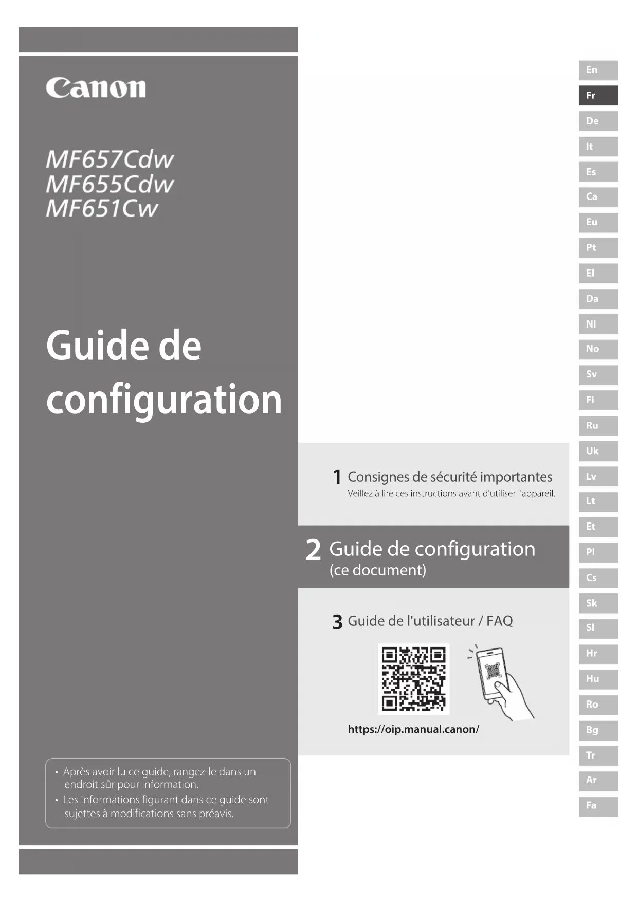 - Après avoir lu ce guide, rangez-le dans un endroit sûr pour information.• Les informations figurant dans ce guide sont sujettes à modifications sans préavis.https://oip.manual.canon/ Consignes de sécurité importantesVeillez à lire ces instructions avant d'utiliser l'appareil. Guide de l'utilisateur / FAQ