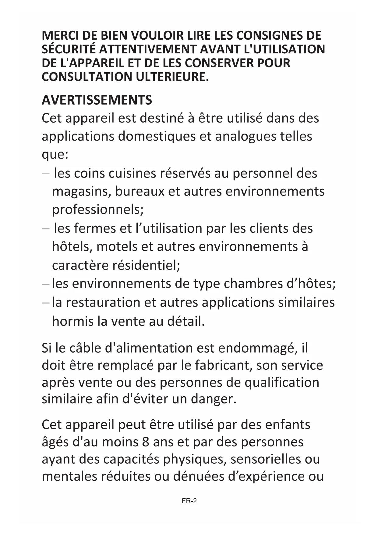 SERVICE DE RÉPARATION ET PIÈCES DE RECHANGE.................................................................................... 27 MISE AU REBUT............................................................................................................................................ 28FR-2 AVERTISSEMENTS Cet appareil est destiné à être utilisé dans des applications domestiques et analogues telles que: les coins cuisines réservés au personnel des magasins, bureaux et autres environnements professionnels; les fermes et l’utilisation par les clients des hôtels, motels et autres environnements à caractère résidentiel; les environnements de type chambres d’hôtes; la restauration et autres applications similaires hormis la vente au détail. Si le câble d'alimentation est endommagé, il doit être remplacé par le fabricant, son service après vente ou des personnes de qualification similaire afin d'éviter un danger. Cet appareil peut être utilisé par des enfants âgés d'au moins 8 ans et par des personnes ayant des capacités physiques, sensorielles ou mentales réduites ou dénuées d’expérience ou MERCI DE BIEN VOULOIR LIRE LES CONSIGNES DE