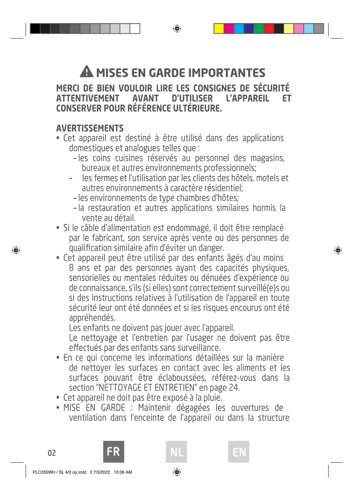 - Ne donnez pas aux enfants des crèmes glacées ou des sorbets PLC265WH / SL 4/3 op.indd 5 7/3/2022 10:36 AM06 directement sortis du compartiment de congélation, car leur température basse peut provoquer des « brûlures par le froid » sur les lèvres.