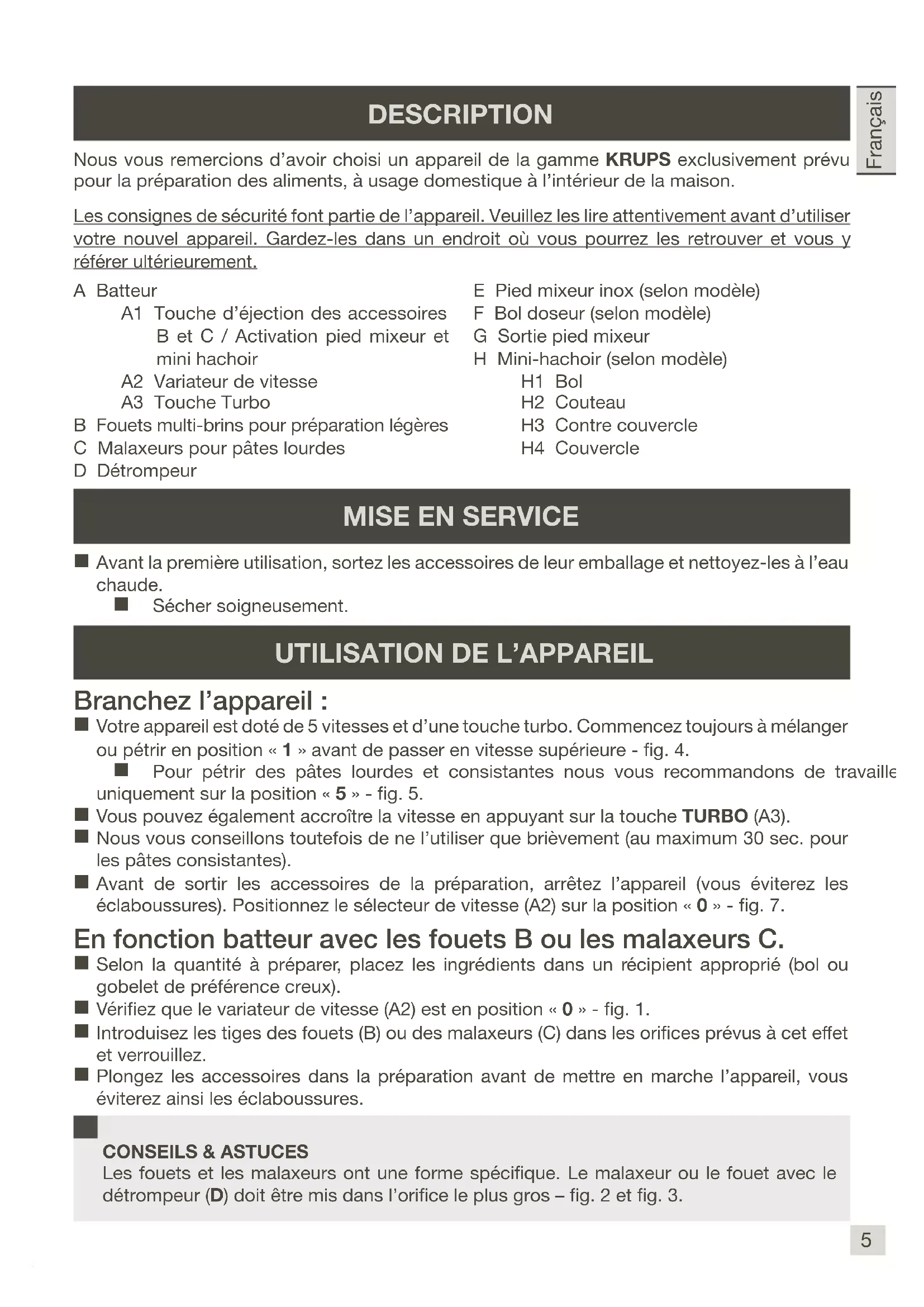 DESCRIPTION A Batteur A1 Touche d’éjection des accessoires B et C / Activation pied mixeur et mini hachoir A2 Variateur de vitesse A3 Touche Turbo B Fouets multi-brins pour préparation légères C Malaxeurs pour pâtes lourdes D Détrompeur E Pied mixeur inox (selon modèle) F Bol doseur (selon modèle) G Sortie pied mixeur H Mini-hachoir (selon modèle) H1 Bol H2 Couteau H3 Contre couvercle H4 Couvercle Nous vous remercions d’avoir choisi un appareil de la gamme KRUPS exclusivement prévu pour la préparation des aliments, à usage domestique à l’intérieur de la maison. Les consignes de sécurité font partie de l’appareil. Veuillez les lire attentivement avant d’utiliser votre nouvel appareil. Gardez-les dans un endroit où vous pourrez les retrouver et vous y référer ultérieurement. Avant la première utilisation, sortez les accessoires de leur emballage et nettoyez-les à l’eau chaude. Sécher soigneusement.