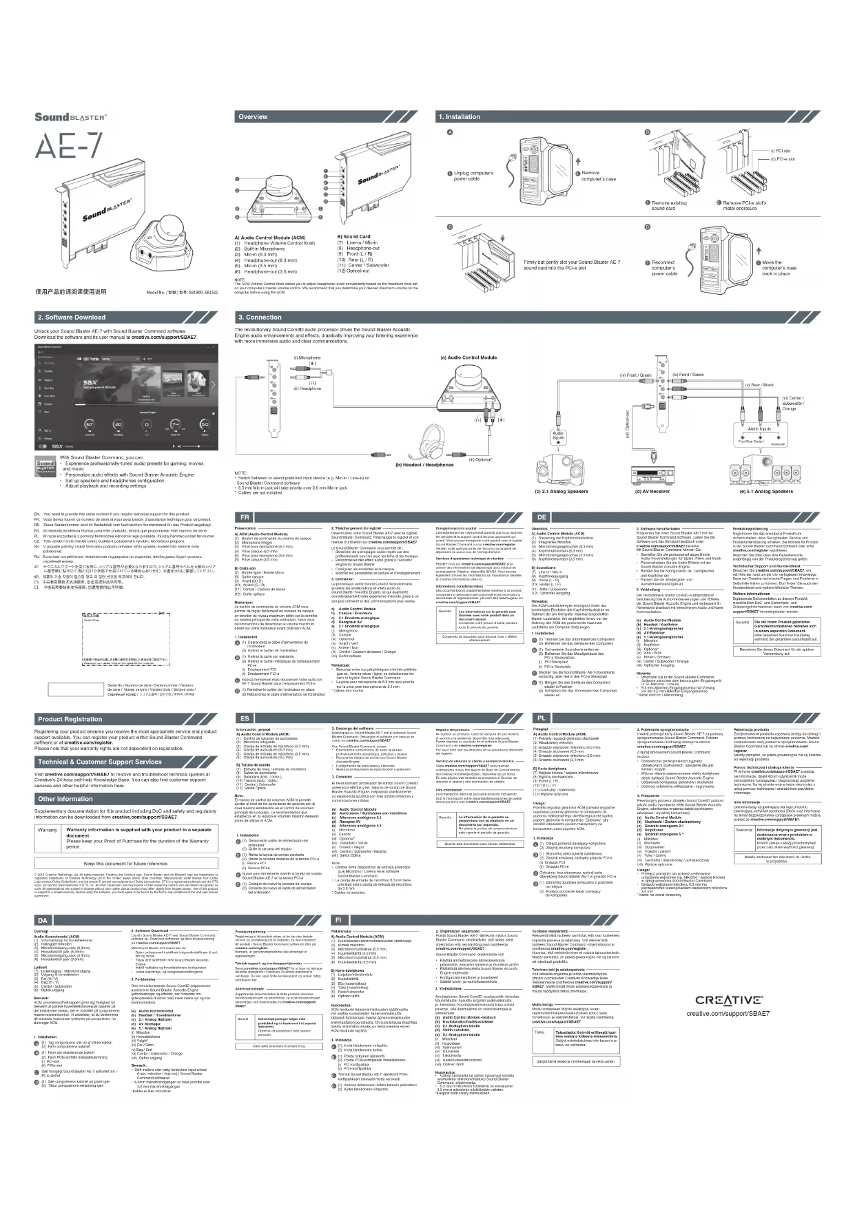 Enregistrement du produit L’enregistrement de votre produit garantit que vous recevrez les services et le support produit les plus appropriés qui soient. Vous pouvez enregistrer votre produit avec le logiciel Sound Blaster Command ou sur creative.com/register. Veuillez noter que vos droits de recours à la garantie ne dépendent en aucun cas de l’enregistrement. Services d’assistance technique et clientèle Rendez-vous sur creative.com/support/SBAE7 pour obtenir des informations de dépannage dans la base de connaissance Creative, disponible 24h/24. Vous pouvez également trouver les informations sur l’assistance clientèle et d’autres informations utiles ici. Informations complémentaires Des documentations supplémentaires relatives à ce produit, notamment la déclaration de conformité et les informations sécuritaires et réglementaires, peuvent être téléchargées sur creative.com/support/SBAE7. Conservez ce document pour pouvoir vous y référer ultérieurement. Les informations sur la garantie sont fournies avec votre produit dans un document séparé. Conservez votre preuve d’achat pendant toute la période de garantie. Garantie Hinweise: Der ACM-Lautstärkeregler ermöglicht Ihnen das komfortable Einstellen der Kopfhörerlautstärke im Rahmen der am Computer maximal eingestellten Master-Lautstärke. Wir empfehlen Ihnen, vor der Nutzung des ACM die gewünschte maximale Lautstärke am Computer festzulegen.A) Audio Control Module (ACM)(1) Control de volumen de auriculares(2) Micrófono integrado(3) Clavija de entrada de micrófono (6.3 mm)(4) Clavija de auriculares (6.3 mm)(5) Clavija de entrada de micrófono (3.5 mm)(6) Clavija de auriculares (3.5 mm)B) Tarjeta de sonido(7) Entrada de línea / entrada de micrófono(8) Salida de auriculares(9) Delantero (izdo. / dcho.)(10) Trasero (izdo. / dcho.)(11) Central / Subwoofer(12) Salida ÓpticaInformación general1. Instalación(1) Desconecte cable de alimentación del ordenador (2) Quite la carcasa del equipo(1) Retire la tarjeta de sonido existente (2) Retire la carcasa metálica de la ranura PCI-e (i) Ranura PCI (ii) Ranura PCI-eSuave pero rmemente inserte la tarjeta de sonido Sound Blaster AE-7 en la ranura PCI-e(1) Coloque de nuevo la carcasa del equipo (2) Conecte de nuevo el cable de alimentación del ordenador