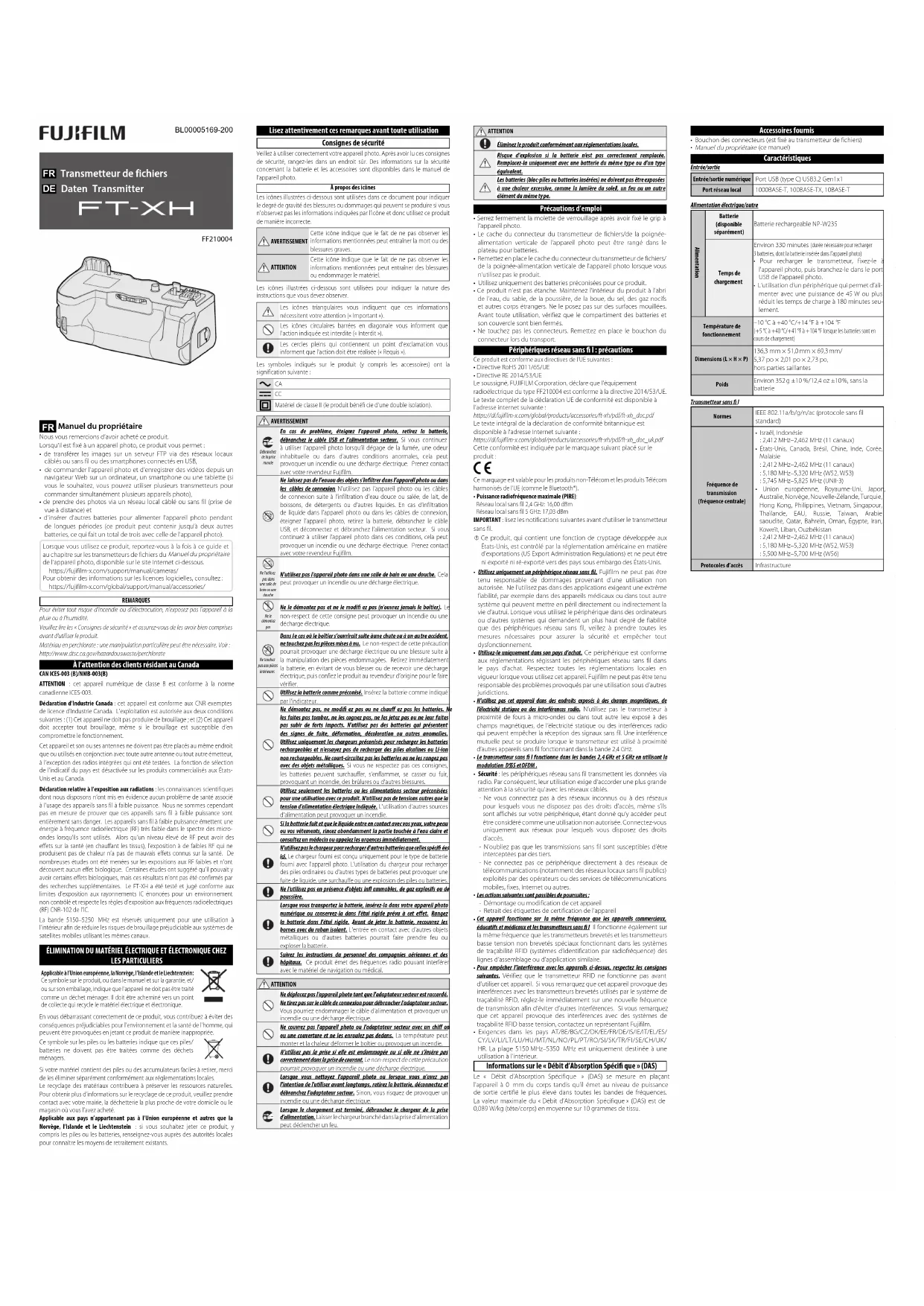 Manuel du propriétaire Nous vous remercions d’avoir acheté ce produit.Lorsqu'il est fixé à un appareil photo, ce produit vous permet:• de transférer les images sur un serveur FTP via des réseaux locaux câblés ou sans fil ou des smartphones connectés en USB,• de commander l'appareil photo et d'enregistrer des vidéos depuis un navigateur Web sur un ordinateur, un smartphone ou une tablette (si vous le souhaitez, vous pouvez utiliser plusieurs transmetteurs pour commander simultanément plusieurs appareils photo),• de prendre des photos via un réseau local câblé ou sans fil (prise de vue à distance) et• d'insérer d'autres batteries pour alimenter l'appareil photo pendant de longues périodes (ce produit peut contenir jusqu'à deux autres batteries, ce qui fait un total de trois avec celle de l'appareil photo).Lorsque vous utilisez ce produit, reportez-vous à la fois à ce guide et au chapitre sur les transmetteurs de fichiers du Manuel du propriétaire de l'appareil photo, disponible sur le site Internet ci-dessous. https://fujifilm-x.com/support/manual/cameras/Pour obtenir des informations sur les licences logicielles, consultez: https://fujifilm-x.com/global/support/manual/accessories/REMARQUESPour éviter tout risque d’incendie ou d’électrocution, n’exposez pas l’appareil à la pluie ou à l’humidité.Veuillez lire les «Consignes de sécurité» et assurez-vous de les avoir bien comprises avant d'utiliser le produit.Matériau en perchlorate: une manipulation particulière peut être nécessaire. Voir:http://www.dtsc.ca.gov/hazardouswaste/perchlorate À l’attention des clients résidant au Canada CAN ICES-003 (B)/NMB-003(B)ATTENTION : cet appareil numérique de classe B est conforme à la norme canadienne ICES-003.Déclaration d’Industrie Canada: cet appareil est conforme aux CNR exemptes de licence d’Industrie Canada. L’exploitation est autorisée aux deux conditions suivantes: (1) Cet appareil ne doit pas produire de brouillage; et (2) Cet appareil doit accepter tout brouillage, même si le brouillage est susceptible d’en compromettre le fonctionnement.Cet appareil et son ou ses antennes ne doivent pas être placés au même endroit que ou utilisés en conjonction avec toute autre antenne ou tout autre émetteur, à l’exception des radios intégrées qui ont été testées. La fonction de sélection de l’indicatif du pays est désactivée sur les produits commercialisés aux États-Unis et au Canada.Déclaration relative à l’exposition aux radiations: les connaissances scientifiques dont nous disposons n’ont mis en évidence aucun problème de santé associé à l’usage des appareils sans fil à faible puissance. Nous ne sommes cependant pas en mesure de prouver que ces appareils sans fil à faible puissance sont entièrement sans danger. Les appareils sans fil à faible puissance émettent une énergie à fréquence radioélectrique (RF) très faible dans le spectre des micro-ondes lorsqu’ils sont utilisés. Alors qu’un niveau élevé de RF peut avoir des effets sur la santé (en chauffant les tissus), l’exposition à de faibles RF qui ne produisent pas de chaleur n’a pas de mauvais effets connus sur la santé. De nombreuses études ont été menées sur les expositions aux RF faibles et n’ont découvert aucun effet biologique. Certaines études ont suggéré qu’il pouvait y avoir certains effets biologiques, mais ces résultats n’ont pas été confirmés par des recherches supplémentaires. Le FT-XH a été testé et jugé conforme aux limites d’exposition aux rayonnements IC énoncées pour un environnement non contrôlé et respecte les règles d’exposition aux fréquences radioélectriques (RF) CNR-102 de l’IC.La bande 5150–5250 MHz est réservés uniquement pour une utilisation à l’intérieur afin de réduire les risques de brouillage préjudiciable aux systèmes de satellites mobiles utilisant les mêmes canaux. ÉLIMINATION DU MATÉRIEL ÉLECTRIQUE ET ÉLECTRONIQUE CHEZ LES PARTICULIERS Applicable à l’Union européenne, la Norvège, l’Islande et le Liechtenstein: Ce symbole sur le produit, ou dans le manuel et sur la garantie, et/ou sur son emballage, indique que l’appareil ne doit pas être traité comme un déchet ménager. Il doit être acheminé vers un point de collecte qui recycle le matériel électrique et électronique.En vous débarrassant correctement de ce produit, vous contribuez à éviter des conséquences préjudiciables pour l’environnement et la santé de l’homme, qui peuvent être provoquées en jetant ce produit de manière inappropriée.Ce symbole sur les piles ou les batteries indique que ces piles/batteries ne doivent pas être traitées comme des déchets ménagers.Si votre matériel contient des piles ou des accumulateurs faciles à retirer, merci de les éliminer séparément conformément aux réglementations locales. Le recyclage des matériaux contribuera à préserver les ressources naturelles. Pour obtenir plus d’informations sur le recyclage de ce produit, veuillez prendre contact avec votre mairie, la déchetterie la plus proche de votre domicile ou le magasin où vous l’avez acheté.Applicable aux pays n’appartenant pas à l’Union européenne et autres que la Norvège, l’Islande et le Liechtenstein : si vous souhaitez jeter ce produit, y compris les piles ou les batteries, renseignez-vous auprès des autorités locales pour connaître les moyens de retraitement existants. Lisez attentivement ces remarques avant toute utilisation Consignes de sécurité Veillez à utiliser correctement votre appareil photo. Après avoir lu ces consignes de sécurité, rangez-les dans un endroit sûr. Des informations sur la sécurité concernant la batterie et les accessoires sont disponibles dans le manuel de l'appareil photo.À propos des icônesLes icônes illustrées ci-dessous sont utilisées dans ce document pour indiquer le degré de gravité des blessu