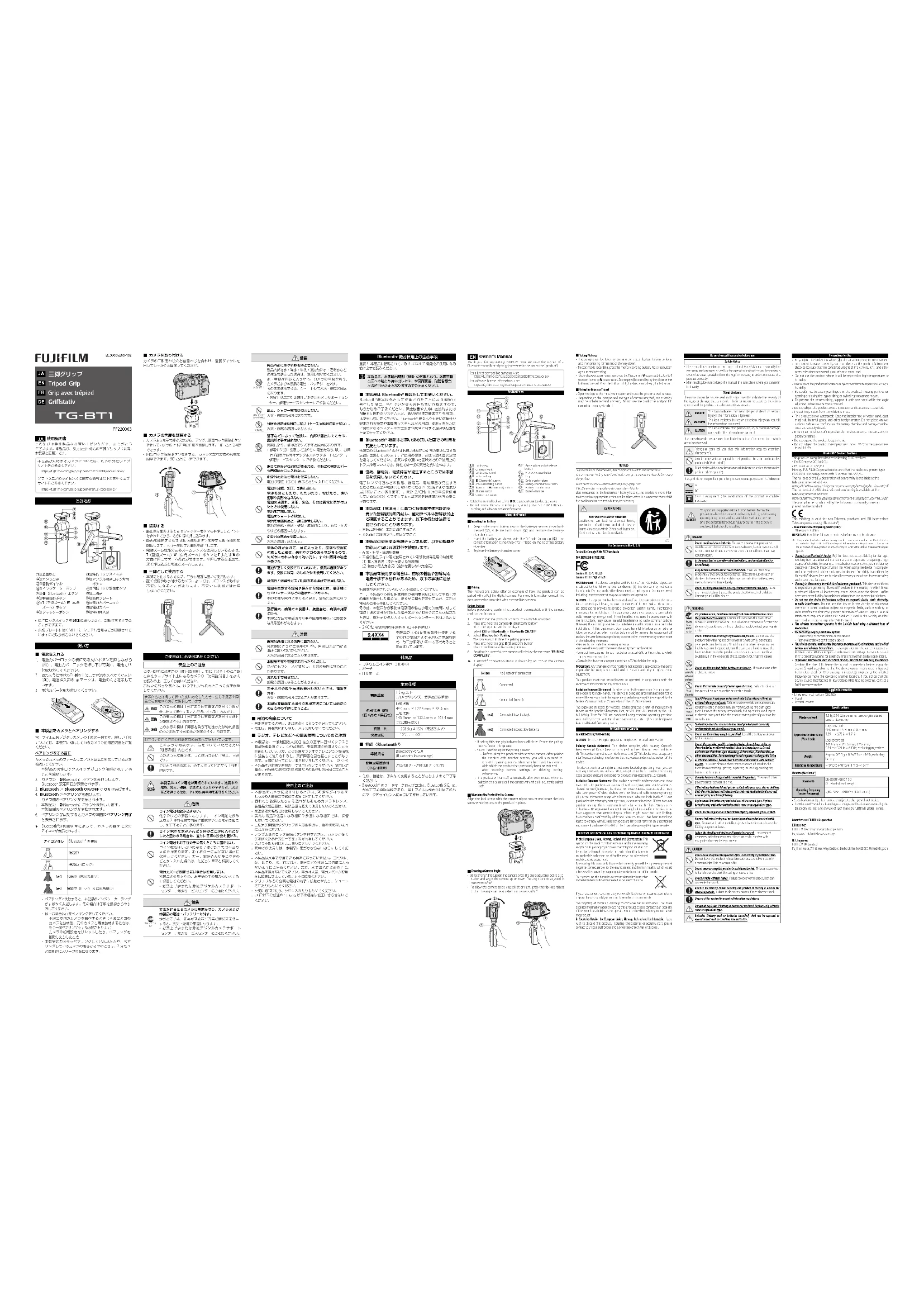 Pour empêcher Pour empêcher l’interférence avec l’interférence avec les appareils ci-des les appareils ci-des sus, respectez les c sus, respectez les c onsignes suivantes. onsignes suivantes. Vérifi ez que le transmetteur RFID ne fonctionne pas avant d’utiliser cet appareil. Si vous remarquez que cet appareil provoque des interférences avec les transmetteurs brevetés utilisés par le système de traçabilité RFID, réglez-le immédiatement sur une nouvelle fréquence de transmission afi n d’éviter d’autres interférences. Si vous remar- quez que cet appareil provoque des interférences avec des systèmes de traçabilité RFID basse tension, contactez un représentant Fujifi lm.Accessoires fournis• Pile bouton au lithium (CR2032)• Étui souple• Documents imprimésCaractéristiques Charge maximale Charge maximale1,5 kg/53,0 oz (poids combiné maximal comprenant l'appareil photo xé et les accessoires) Dimensions approxima- Dimensions approxima- tives (L × H × P) tives (L × H × P)Pieds fermés:48,0 mm × 172,3 mm × 38,3 mm/1,89 po × 6,78 po × 1,51 poPieds ouverts:145,9 mm × 132,3 mm × 163,4 mm/5,74po × 5,21po × 6,43po, hors parties saillantes Poids PoidsEnviron 205,5 g ±10 %/7,3oz ±10 %, sans la batterie Température de fonction- Température de fonction- nement nement–10 °C à +40 °C/+14°F à +104°FSans l (Bluetooth®) Normes Normes Bluetooth version 5.0 (Bluetooth Low Energy) Fréquence de transmission Fréquence de transmission (fréquence centrale) (fréquence centrale)2,402 MHz–2,480 MHz (40 canaux)• Les caractéristiques et les performances peuvent faire l'objet de modifi cations sans préavis.• La marque et les logos Bluetooth® sont des marques déposées appartenant à Bluetooth SIG, Inc. et leur utilisation par Fujifi lm s'eff ectue sous licence.