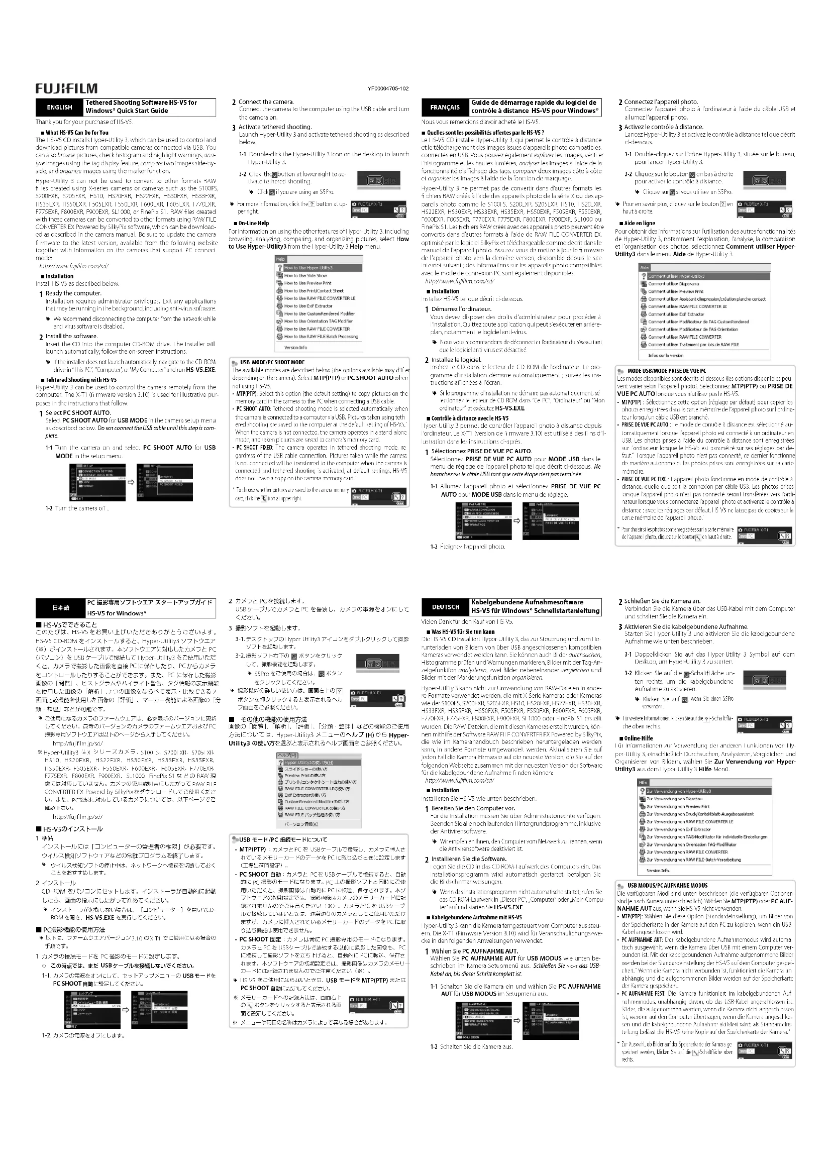 メニューや項目の名称はカメラによって異なる場合があります。 FRANÇAIS Guide de démarrage rapide du logiciel de Guide de démarrage rapide du logiciel de contrôle à distance HS-V5 pour Windows® contrôle à distance HS-V5 pour Windows® Nous vous remercions d’avoir acheté le HS-V5. ■ Quelles sont les possibilités o ertes par le HS-V5 ? Le HS-V5 CD installe Hyper-Utility 3, qui permet le contrôle à distance et le téléchargement des images issues d’appareils photo compatibles, connectés en USB. Vous pouvez également explorer les images, véri er l’histogramme et les hautes lumières, analyser les images à l’aide de la fonctionnalité d’a chage des tags, comparer deux images côte à côte et organiser les images à l’aide de la fonction de marquage. Hyper-Utility 3 ne permet pas de convertir dans d’autres formats les chiers RAW créés à l’aide des appareils photo de la série X ou des ap- pareils photo comme le S100FS, S200EXR, S205EXR, HS10, HS20EXR, HS22EXR, HS30EXR, HS33EXR, HS35EXR, HS50EXR, F505EXR, F550EXR, F600EXR, F605EXR, F770EXR, F775EXR, F800EXR, F900EXR, SL1000 ou FinePix S1. Les chiers RAW créés avec ces appareils photo peuvent être convertis dans d’autres formats à l’aide de RAW FILE CONVERTER EX, optimisé par le logiciel SilkyPix et téléchargeable comme décrit dans le manuel de l’appareil photo. Assurez-vous de mettre à jour le rmware de l’appareil photo vers la dernière version, disponible depuis le site Internet suivant ; des informations sur les appareils photo compatibles avec le mode de connexion PC sont également disponibles. http://www.fujifilm.com/sd/ ■ Installation Installez HS-V5 tel que décrit ci-dessous.