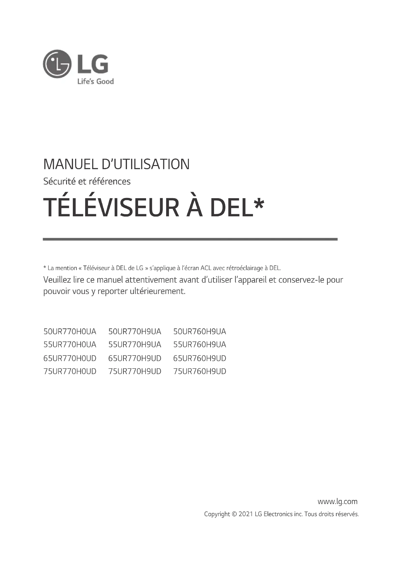 50UR770H0UA 55UR770H0UA 65UR770H0UD 75UR770H0UD 50UR770H9UA 55UR770H9UA 65UR770H9UD 75UR770H9UD 50UR760H9UA 55UR760H9UA 65UR760H9UD 75UR760H9UD www.lg.com Copyright © 2021 LG Electronics inc. Tous droits réservés.* La mention « Téléviseur à DEL de LG » s’applique à l’écran ACL avec rétroéclairage à DEL. Veuillez lire ce manuel attentivement avant d’utiliser l’appareil et conservez-le pour pouvoir vous y reporter ultérieurement.2 FRANÇAIS