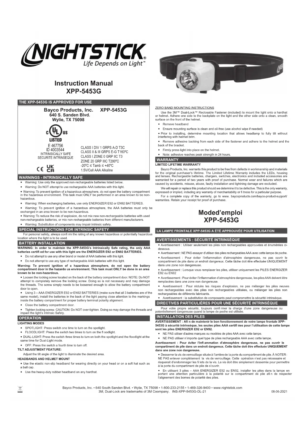 AVERTISSEMENT : A n de maintenir le bon fonctionnement de votre lampe frontale XPP-5453G à sécurité intrinsèque, les seules piles AAA certi ées pour l’utilisation de cette lampe sont les piles ENERGIZER E92 or EN92.y NE PAS utiliser d’autres marques ou modèles de piles AAA avec cette lampe.y NE PAS utiliser n’importe quel type de piles rechargeable AAA avec cette lampe.Avertissement : Pour éviter l’in ammation d’atmosphère dangereuse, ne pas ouvrir le compartiment de pile dans un endroit dangereux. Cette tâche doit être effectuée UNIQUEMENT dans une zone non dangereuse. y Desserrer la vis de verrouillage située à l’arrière de la porte du compartiment de pile. À NOTER : NE PAS enlever complètement la vis de verrouillage. Cette opération n’est pas nécessaire et risquerait d’endommager les lets de la vis. La vis doit être simplement desserrée pour permettre à la porte du compartiment de pile de s’ouvrir.y En utilisant 3 piles – AAA ENERGIZER E92 ou EN92, installer les piles dans la lampe en portant une attention particulière à la polarité sur le compartiment de pile a n de respecter l’alignement des bornes de polarité des piles.Bayco Products, Inc. • 640 South Sanden Blvd. • Wylie, TX 75098 • 1-800-233-2155 • 1-469-326-9400 • www.nightstick.com 3M, Dual-Lock are trademarks of 3M Coompany. INS-XPP-5453G-DL-21 08-06-2021 y Fermer la porte du compartiment de pile. y NE PAS trop serrer. MISE EN GARDE : Si vous serrez trop vous risquez d’endommager les lets et affecter la sécurité intrinsèque de la lampe. FONCTIONNEMENT