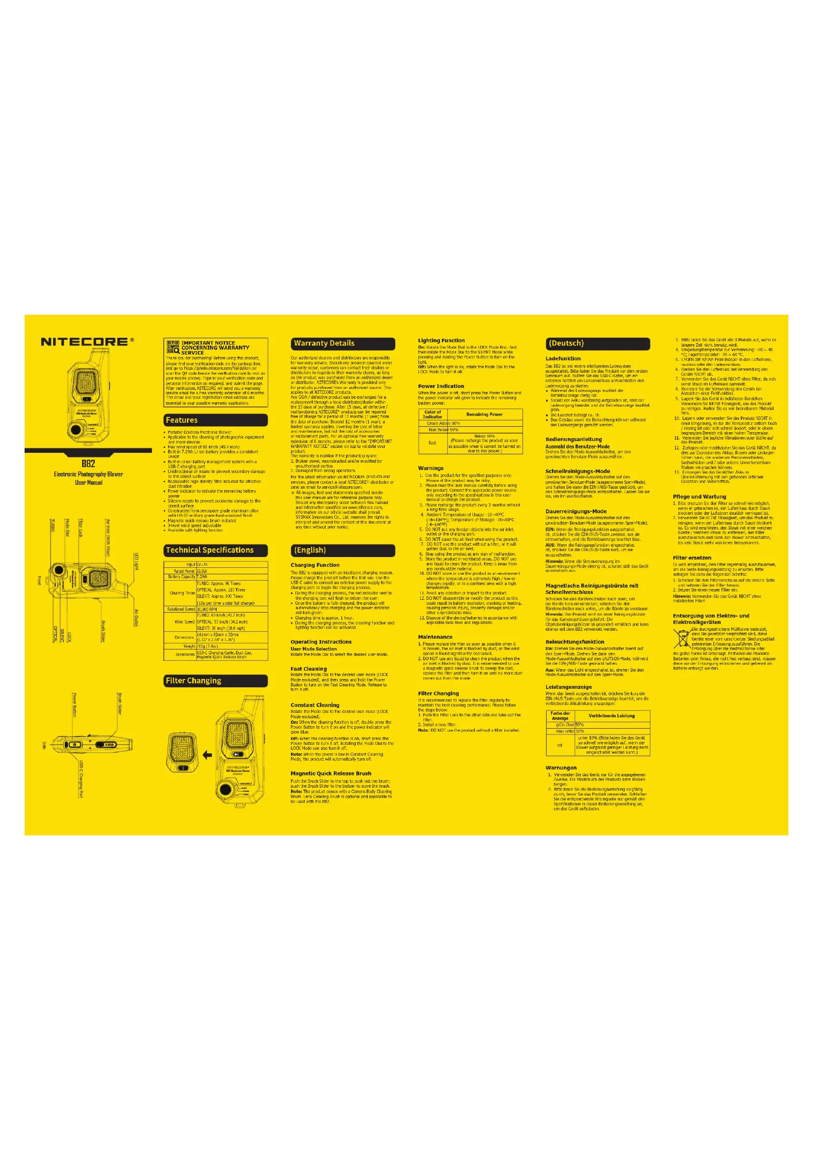 (简体中文)售后服务的重要提示 感谢您购买本产品!在使用本产品之前,请持包装盒上防伪码登录 https://photo.nitecore.cn/Validation或刮开防伪贴纸的二维码,用手机扫描前往验证页面,按页面提示填写防伪码及个人信息等资料。成功通过正品验证后,您将收到奈特科尔发来的保固凭证邮件,产品可获得额外 6个月的免费保固期。请紧记您的注册邮箱及保存售后服务邮件,此资料为该产品享受保固服务的重要凭证。 Thanks for purchasing NITECORE! Please find us on facebook: nitecoreimage (Francais) Fonction de charge Le BB2 est équipé d’un système de charge intelligent. Veuillez charger le produit avant la première utilisation. Utilisez le câble USB-C pour connecter une alimentation externe au port de charge an de commencer le processus de charge.● Pendant le processus de charge, l’indicateur rouge à côté du port de charge clignote pour informer l’utilisateur.● Une fois la batterie complètement chargée, le produit s’arrête automatiquement de charger et l’indicateur d’alimentation devient vert.● Le temps de charge est d’environ 1 heure.● Pendant le processus de charge, la fonction de nettoyage et la fonction d’éclairage peuvent être activées. Mode d’emploi Sélection du mode utilisateur Faites pivoter la molette de mode pour sélectionner le mode utilisateur souhaité Nettoyage rapide Faites pivoter la molette de mode vers le mode utilisateur souhaité (mode LOCK exclu), puis maintenez enfoncé le bouton d’alimentation pour activer le mode de nettoyage rapide. Relâchez pour l’éteindre. Nettoyage continu Faites pivoter la molette de mode vers le mode utilisateur souhaité (mode LOCK exclu).ON : Lorsque la fonction de nettoyage est désactivée, appuyez deux fois sur le bouton d’alimentation pour l’allumer et l’indicateur d’alimentation s’allume en bleu.OFF : Lorsque la fonction de nettoyage est activée, appuyez brièvement sur le bouton d’alimentation pour l’éteindre. La rotation de la molette vers le mode LOCK peut également l’éteindre.Remarque : Lorsque l’alimentation est faible en mode de nettoyage constant, le produit s’éteint automatiquement. Brosse magnétique rapidement détachable Poussez le curseur de la brosse vers le haut pour faire sortir la brosse; poussez le curseur de la brosse vers le bas pour la ranger. Remarque : Le produit est livré avec une brosse de nettoyage du corps de la caméra. La brosse de nettoyage de lentille est facultative et peut être utilisée avec le BB2. Fonction d’éclairage ON : Faites d’abord pivoter la molette de mode vers le mode LOCK. Puis, faites pivoter la molette de mode vers le mode SILENT tout en appuyant et en maintenant le bouton d’alimentation enfoncé pour allumer la lumière.OFF : Lorsque le voyant est allumé, faites pivoter la molette de mode sur le mode LOCK pour l’éteindre. Indication de batterie Lorsque l’alimentation est coupée, appuyez brièvement sur le bouton d’alimentation et l’indicateur s’allumera pour indiquer la puissance restante de la batterie :Couleur de l’indicateurBatterie restanteVert Plus de 50%Bleu Moins de 50%RougeMoins de 10% (Veuillez recharger le produit dès que possible lorsqu’il ne peut pas être allumé en raison d’une faible puissance.) Avertissements 1. Utilisez le produit uniquement aux ns spéciées. Une mauvaise utilisation du produit peut être risquée. 2. Veuillez lire attentivement le manuel avant d’utiliser le produit. Connectez la source d’alimentation applicable uniquement selon les spécications de ce manuel d’utilisation pour charger le produit.