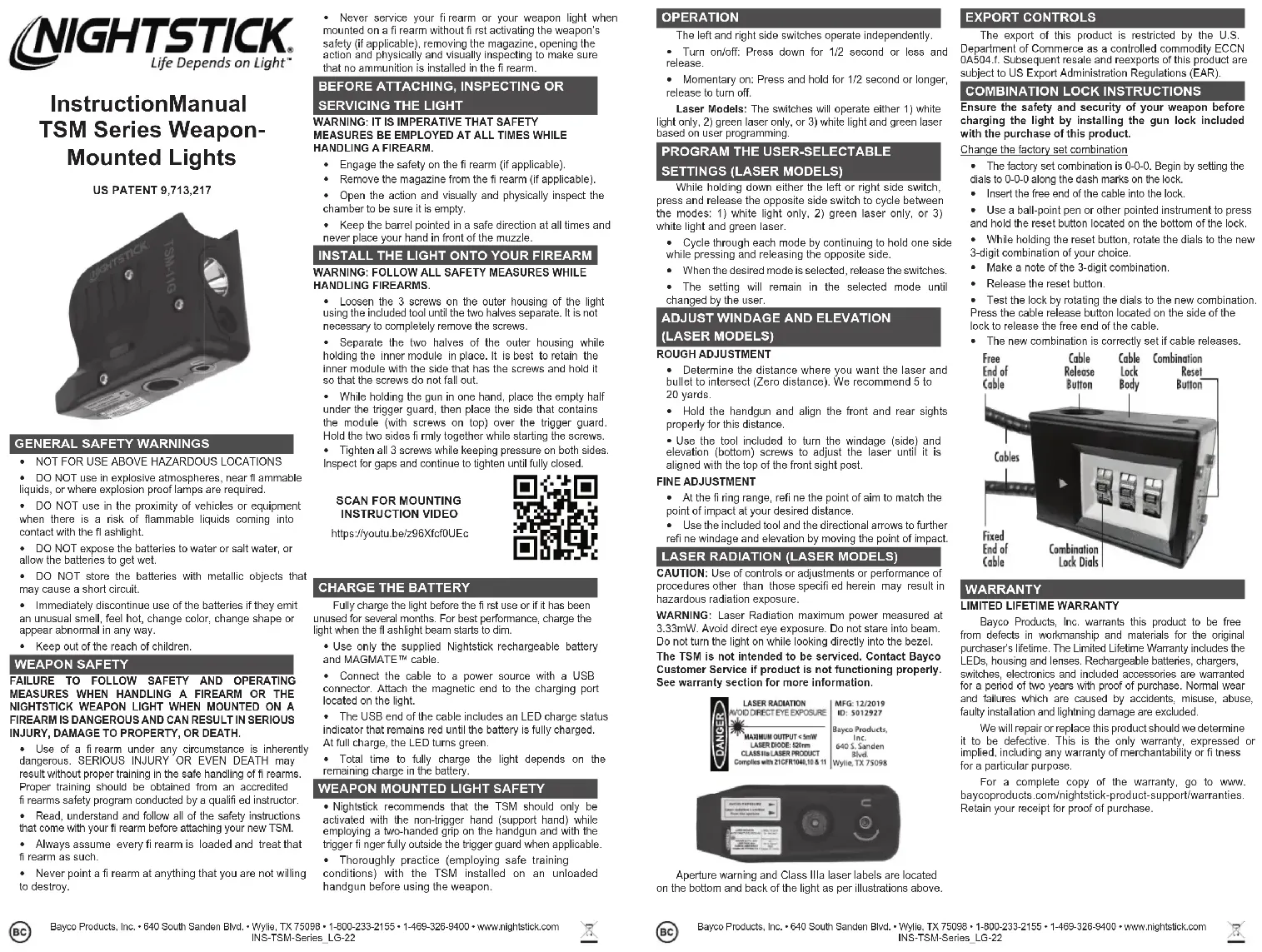 INSTALLEZ JAMAIS LE VERROU DU PONTET SUR UNE ARME CHARGÉE.Charger complètement la lampe avant la première utilisation ou si la pile est neuve ou n’a pas été utilisée pendant plusieurs mois. Pour de meilleurs résultats, charger la lampe lorsque le faisceau de lumière commence à faiblir. Utilisez uniquement la batterie rechargeable et le MAGMATE™ câble Nightstick fournis.Bayco Products, Inc. • 640 South Sanden Blvd. • Wylie, TX 75098 • 1-800-233-2155 • 1-469-326-9400 • www.nightstick.comINS-TSM-Series_LG-22Bayco Products, Inc. • 640 South Sanden Blvd. • Wylie, TX 75098 • 1-800-233-2155 • 1-469-326-9400 • www.nightstick.comINS-TSM-Series_LG-22 Manual de Instrucciones TSM Series Weapon-Mounted Light