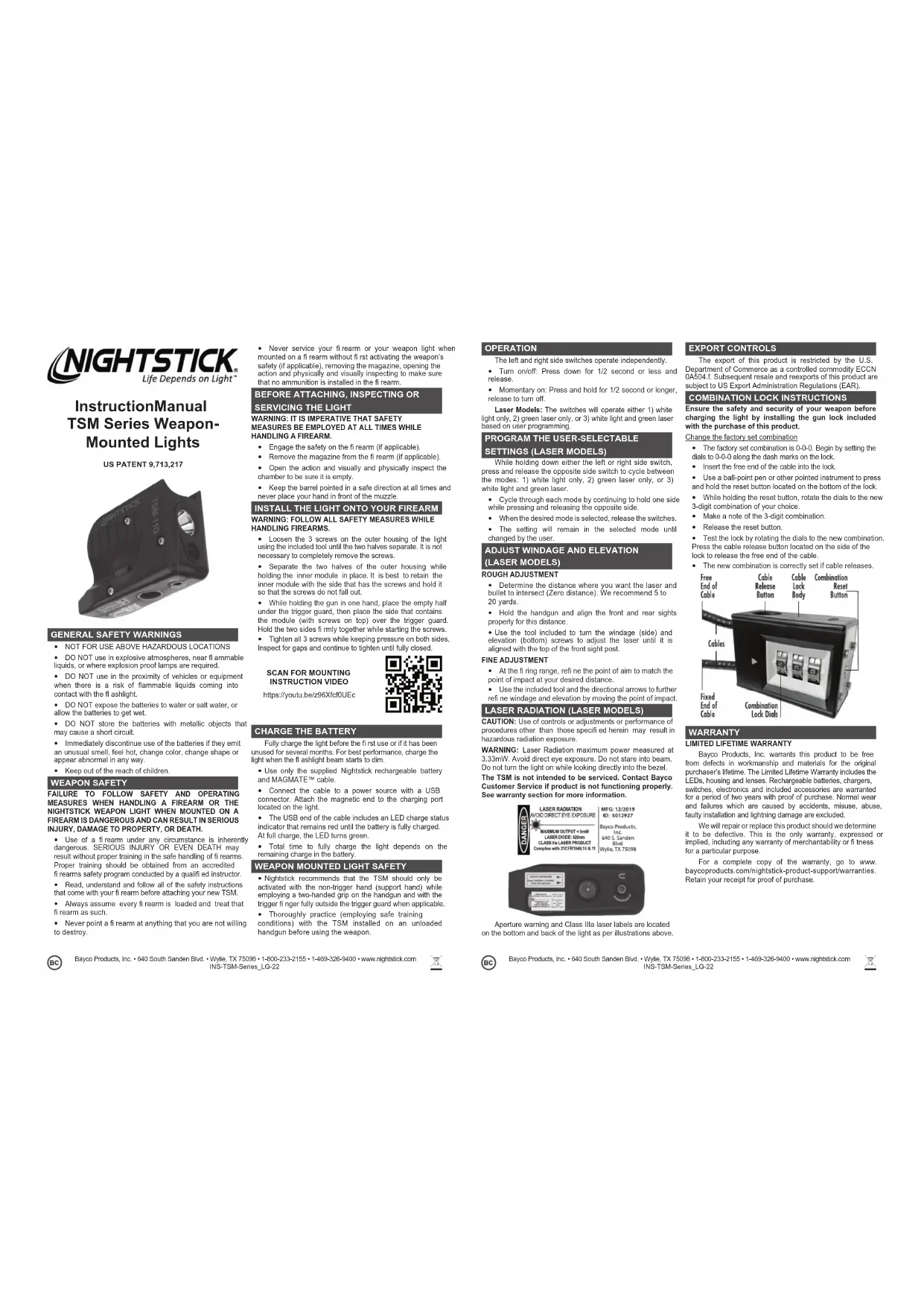 INSTALLEZ JAMAIS LE VERROU DU PONTET SUR UNE ARME CHARGÉE.Charger complètement la lampe avant la première utilisation ou si la pile est neuve ou n’a pas été utilisée pendant plusieurs mois. Pour de meilleurs résultats, charger la lampe lorsque le faisceau de lumière commence à faiblir. Utilisez uniquement la batterie rechargeable et le MAGMATE™ câble Nightstick fournis.Bayco Products, Inc. • 640 South Sanden Blvd. • Wylie, TX 75098 • 1-800-233-2155 • 1-469-326-9400 • www.nightstick.comINS-TSM-Series_LG-22Bayco Products, Inc. • 640 South Sanden Blvd. • Wylie, TX 75098 • 1-800-233-2155 • 1-469-326-9400 • www.nightstick.comINS-TSM-Series_LG-22 Manual de Instrucciones TSM Series Weapon-Mounted Light