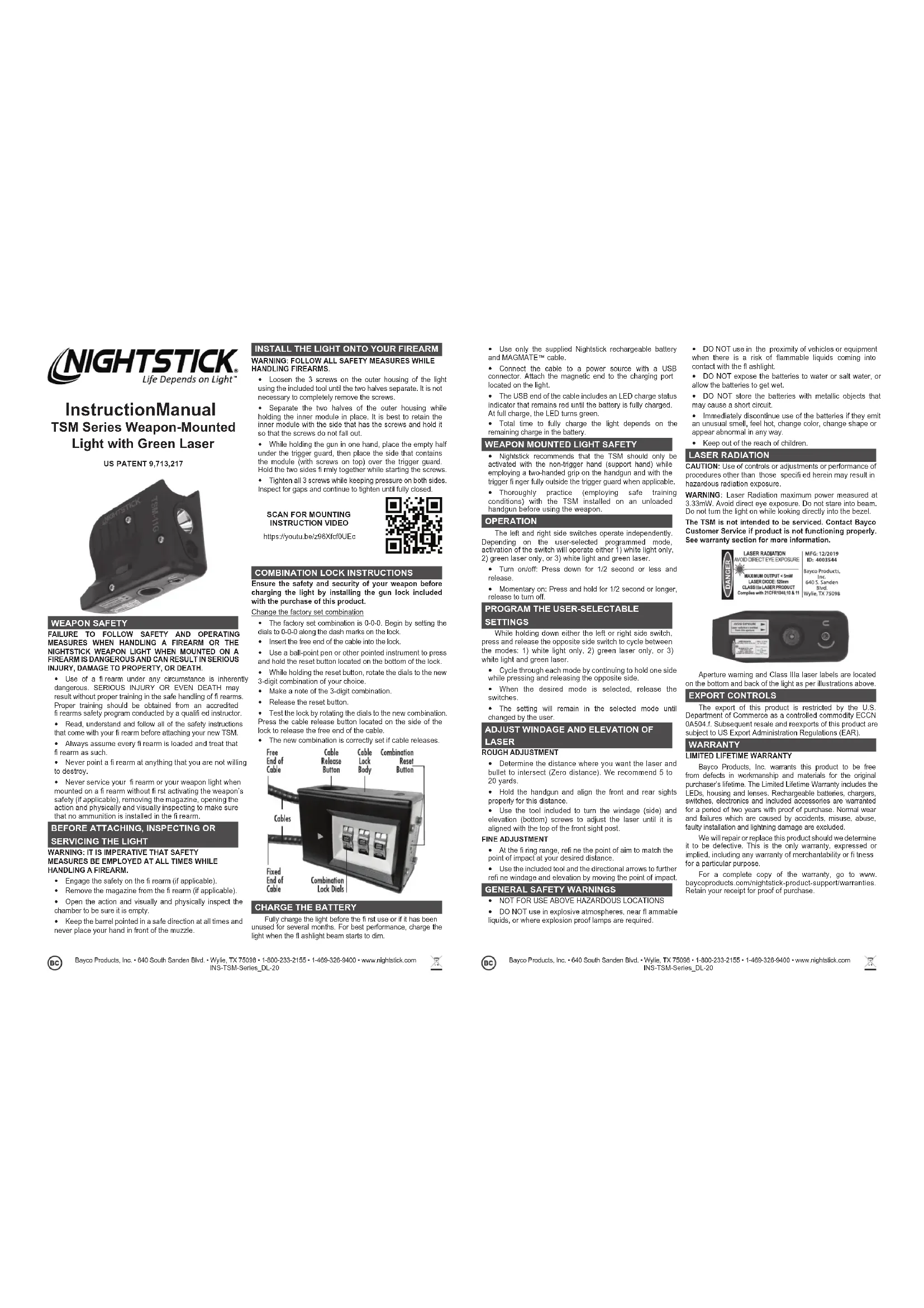 INSTALLEZ JAMAIS LE VERROU DU PONTET SUR UNE ARME CHARGÉE.Charger complètement la lampe avant la première utilisation ou si la pile est neuve ou n’a pas été utilisée pendant plusieurs mois. Pour de meilleurs résultats, charger la lampe lorsque le faisceau de lumière commence à faiblir. Utilisez uniquement la batterie rechargeable et le MAGMATE™ câble Nightstick fournis. Connectez le MAGMATE câble à une sourceBayco Products, Inc. • 640 South Sanden Blvd. • Wylie, TX 75098 • 1-800-233-2155 • 1-469-326-9400 • www.nightstick.comINS-TSM-Series_DL-20Bayco Products, Inc. • 640 South Sanden Blvd. • Wylie, TX 75098 • 1-800-233-2155 • 1-469-326-9400 • www.nightstick.comINS-TSM-Series_DL-20 Manual de Instrucciones TSM Series Weapon-Mounted Light with Green Laser
