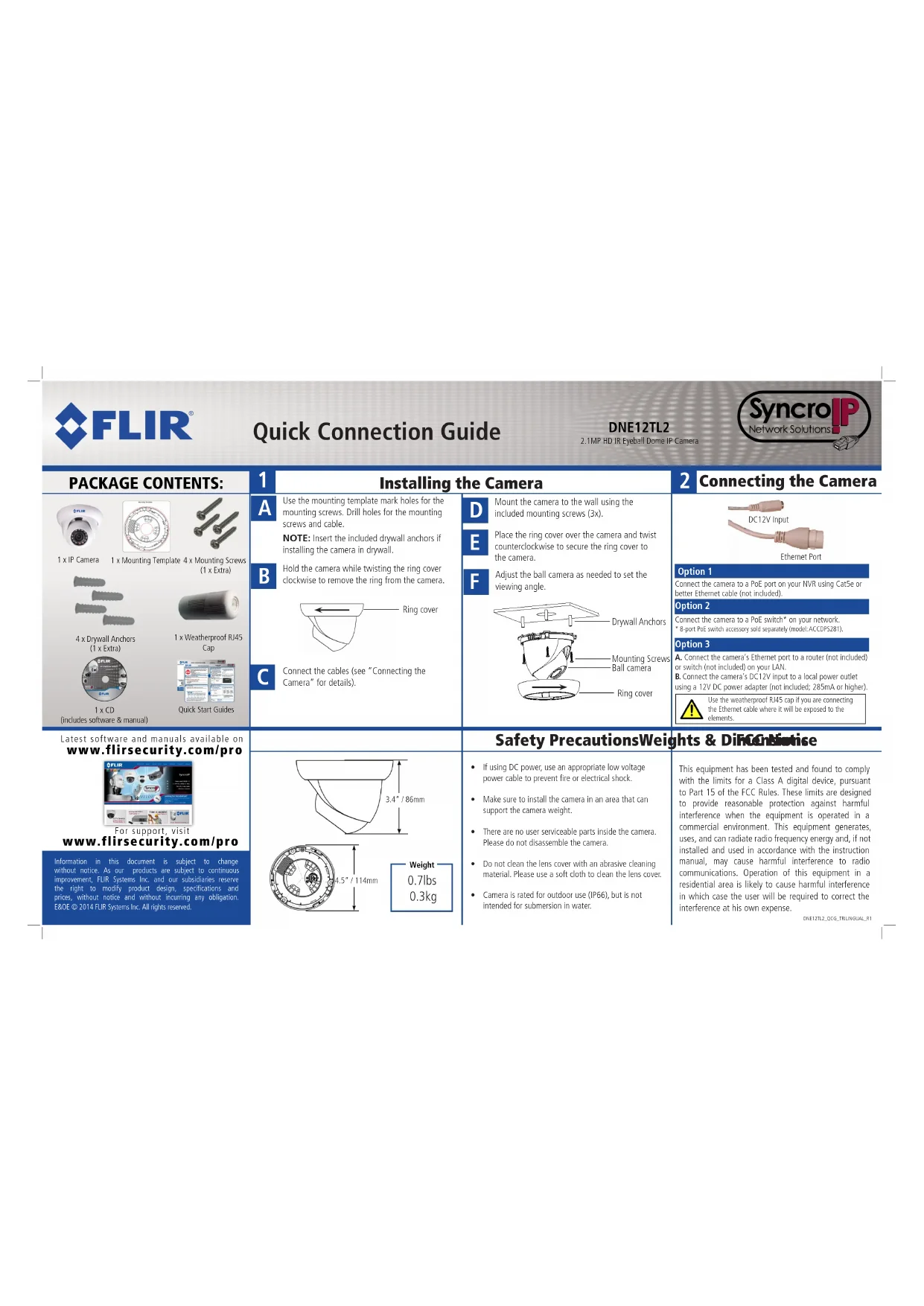 Les informations contenues dans ce document sont indiquées sous réserve de modifications sans préavis. Nos produits étant sans cesse améliorés, FLIR Systems Inc. et ses filiales se réservent le droit de modifier la conception du produit, les spécifications et les prix sans préavis et sans aucune obligation. E&OE © 2014 FLIR Systems Inc. Tous droits réservés. Branchement de la caméraDimensions et poidsMesures de sécuritéAvis de la FCCCet équipement a été examiné et s’est avéré conforme avec les limites pour un dispositif numérique de classe A, conformément à la partie 15 des règles de la FCC. Ces limites sont conçues pour assurer une protection raisonnable contre l’interférence lorsque l’équipement est utilisé dans un établissement commercial. Cet équipement produit, utilise et peut émettre de l’énergie de radiofréquence et s’il n’est pas installé et utilisé selon les instructions, peut causer de l’interférence nuisible aux radiocommunications. L’utilisation de cet équipement dans une résidence est susceptible de causer des interférences nuisibles et l’utilisateur devra corriger, à ses frais, les fréquences émises.Pour obtenir de l’aide, visitez l’adresse www.flirsecurity.com/pro www.flirsecurity.com/pro Les plus récents logiciels et manuels sont disponibles à l'adresse : CONTENU DE L’EMBALLAGE : Installation de la caméra