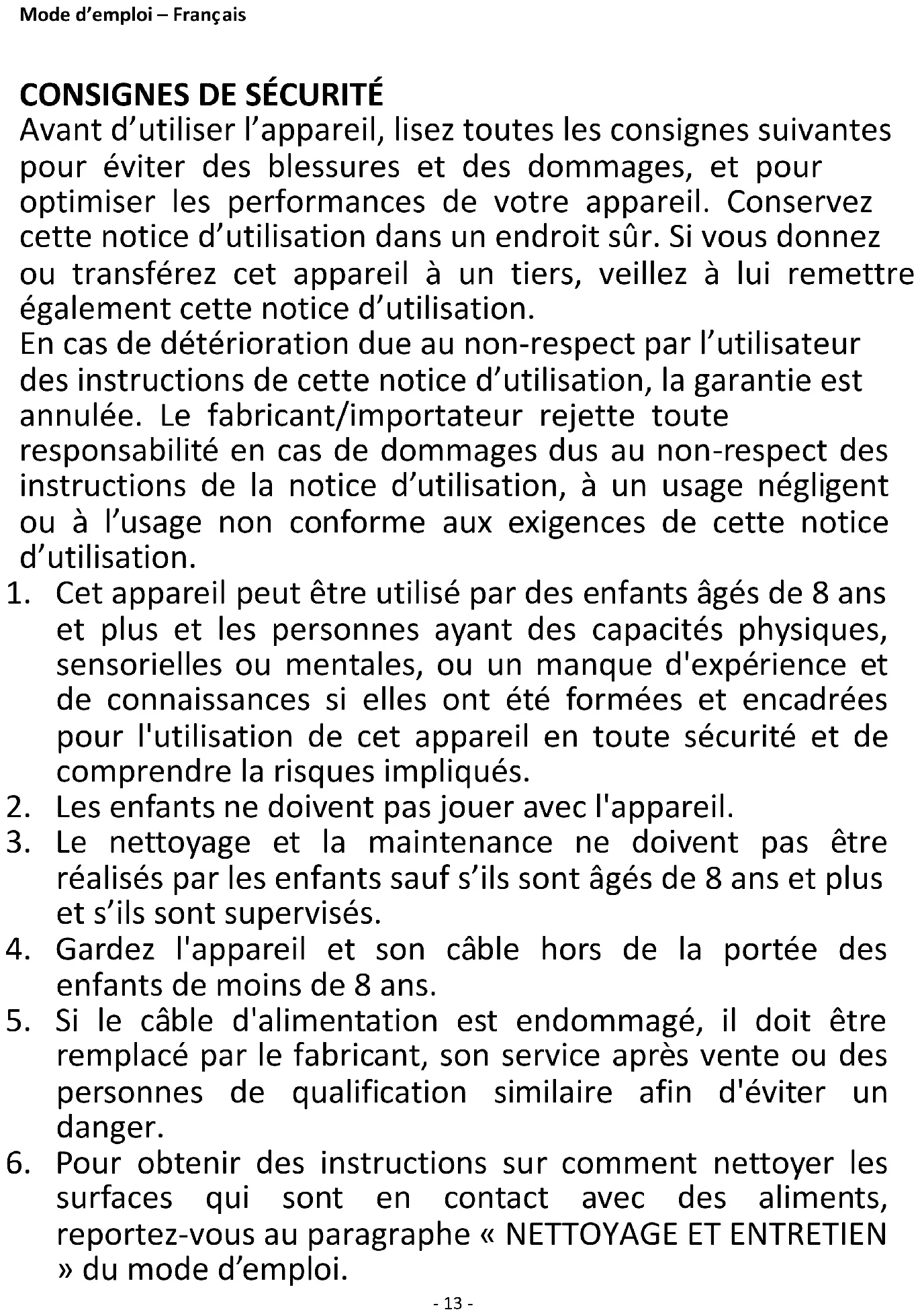 Avant d’utiliser l’appareil, lisez toutes les consignes suivantes pour éviter des blessures et des dommages, et pour optimiser les performances de votre appareil. Conservez cette notice d’utilisation dans un endroit sûr. Si vous donnez ou transférez cet appareil à un tiers, veillez à lui remettre également cette notice d’utilisation. En cas de détérioration due au non-respect par l’utilisateur des instructions de cette notice d’utilisation, la garantie est annulée. Le fabricant/importateur rejette toute responsabilité en cas de dommages dus au non-respect des instructions de la notice d’utilisation, à un usage négligent ou à l’usage non conforme aux exigences de cette notice d’utilisation.