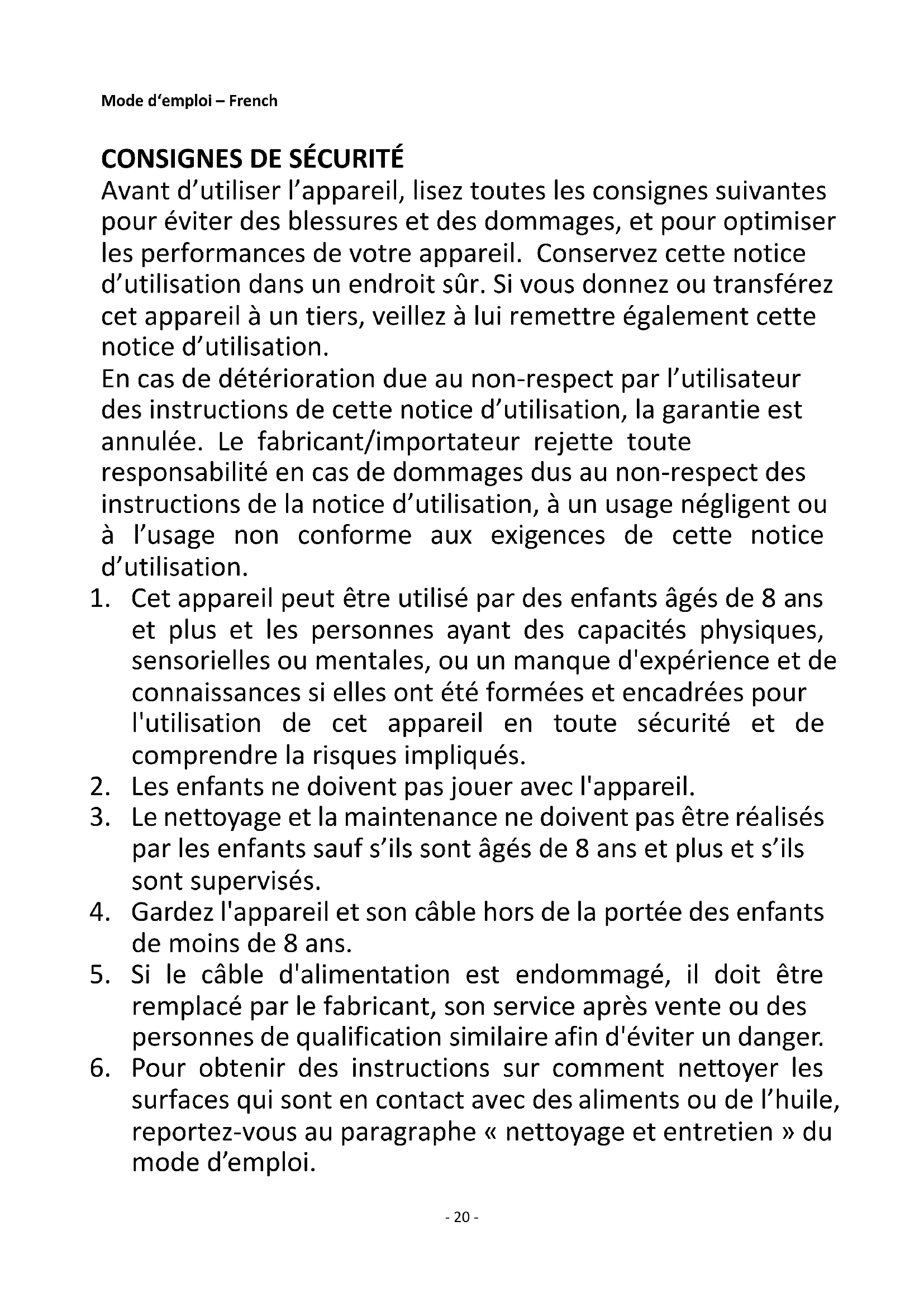 Avant d’utiliser l’appareil, lisez toutes les consignes suivantes pour éviter des blessures et des dommages, et pour optimiser les performances de votre appareil. Conservez cette notice d’utilisation dans un endroit sûr. Si vous donnez ou transférez cet appareil à un tiers, veillez à lui remettre également cette notice d’utilisation. En cas de détérioration due au non-respect par l’utilisateur des instructions de cette notice d’utilisation, la garantie est annulée. Le fabricant/importateur rejette toute responsabilité en cas de dommages dus au non-respect des instructions de la notice d’utilisation, à un usage négligent ou à l’usage non conforme aux exigences de cette notice d’utilisation.