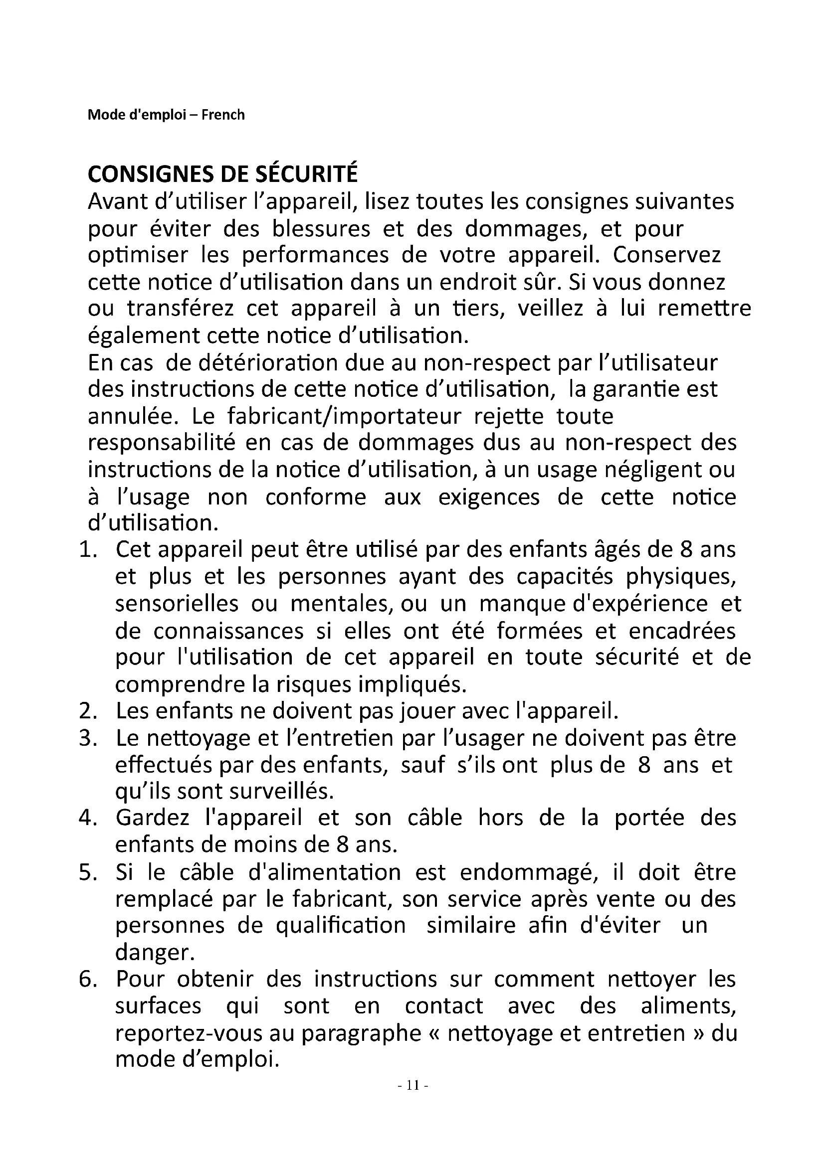 Avant d’utiliser l’appareil, lisez toutes les consignes suivantes pour éviter des blessures et des dommages, et pour optimiser les performances de votre appareil. Conservez cette notice d’utilisation dans un endroit sûr. Si vous donnez ou transférez cet appareil à un tiers, veillez à lui remettre également cette notice d’utilisation. En cas de détérioration due au non-respect par l’utilisateur des instructions de cette notice d’utilisation, la garantie est annulée. Le fabricant/importateur rejette toute responsabilité en cas de dommages dus au non-respect des instructions de la notice d’utilisation, à un usage négligent ou à l’usage non conforme aux exigences de cette notice d’utilisation.