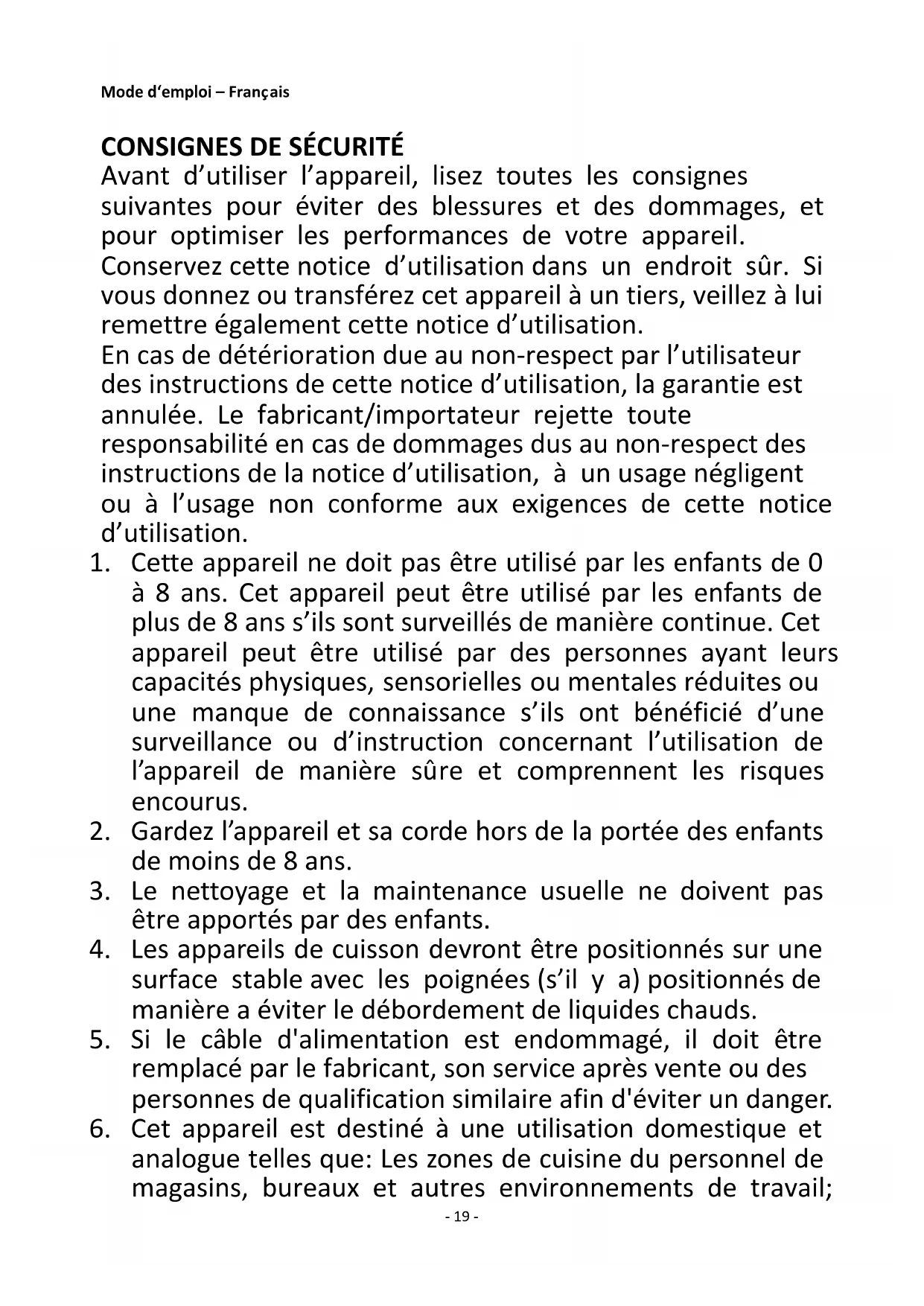Avant d’utiliser l’appareil, lisez toutes les consignes suivantes pour éviter des blessures et des dommages, et pour optimiser les performances de votre appareil. Conservez cette notice d’utilisation dans un endroit sûr. Si vous donnez ou transférez cet appareil à un tiers, veillez à lui remettre également cette notice d’utilisation. En cas de détérioration due au non-respect par l’utilisateur des instructions de cette notice d’utilisation, la garantie est annulée. Le fabricant/importateur rejette toute responsabilité en cas de dommages dus au non-respect des instructions de la notice d’utilisation, à un usage négligent ou à l’usage non conforme aux exigences de cette notice d’utilisation.