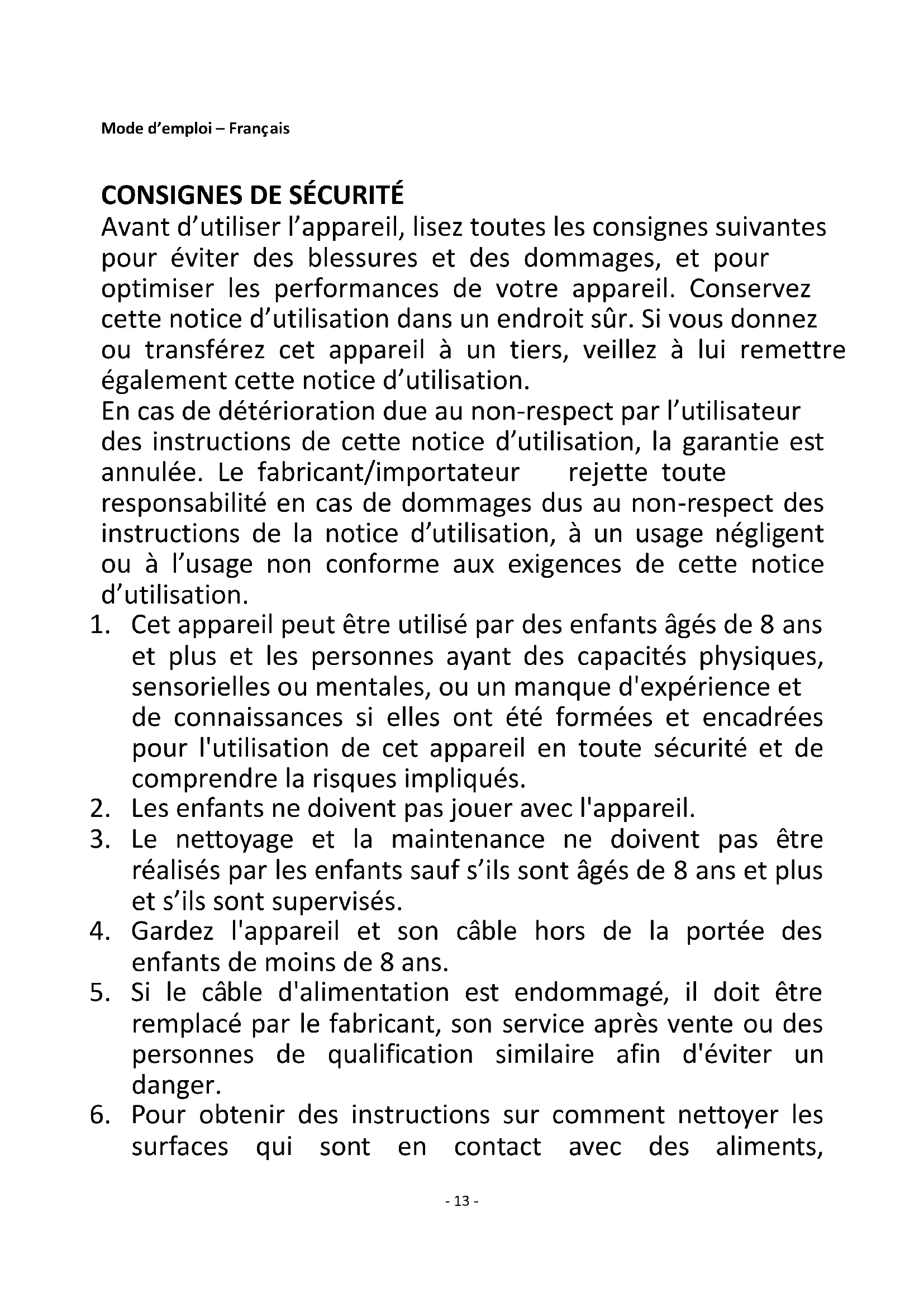 Avant d’utiliser l’appareil, lisez toutes les consignes suivantes pour éviter des blessures et des dommages, et pour optimiser les performances de votre appareil. Conservez cette notice d’utilisation dans un endroit sûr. Si vous donnez ou transférez cet appareil à un tiers, veillez à lui remettre également cette notice d’utilisation. En cas de détérioration due au non-respect par l’utilisateur des instructions de cette notice d’utilisation, la garantie est annulée. Le fabricant/importateur rejette toute responsabilité en cas de dommages dus au non-respect des instructions de la notice d’utilisation, à un usage négligent ou à l’usage non conforme aux exigences de cette notice d’utilisation.