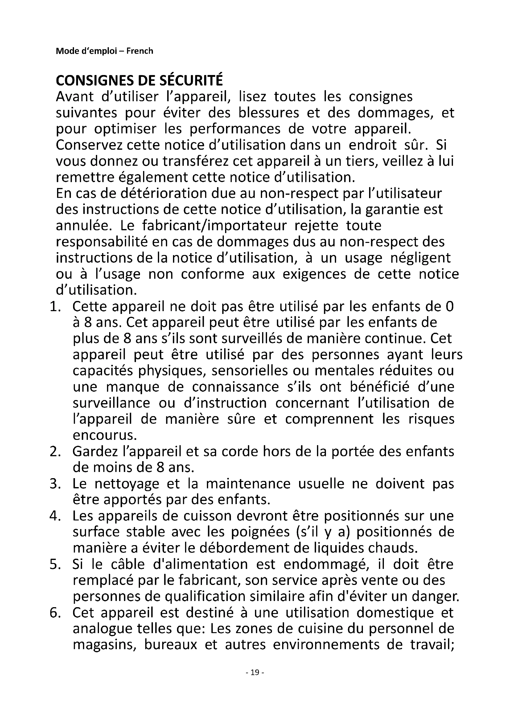 19. Cet appareil n’est pas conçu pour un usage commercial.