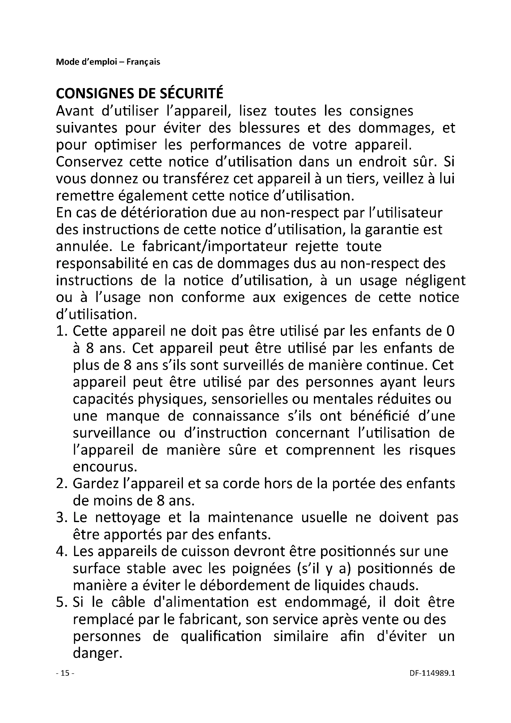 Débranchez la fiche de la prise électrique, éteignez- 17 - DF-114989.1 l’appareil et rapportez-le au centre de réparation agréé pour le faire réparer.