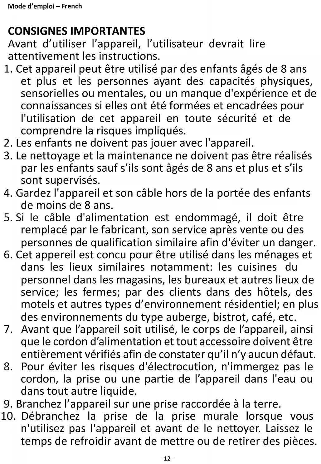 8. Pour éviter les risques d'électrocution, n'immergez pas le